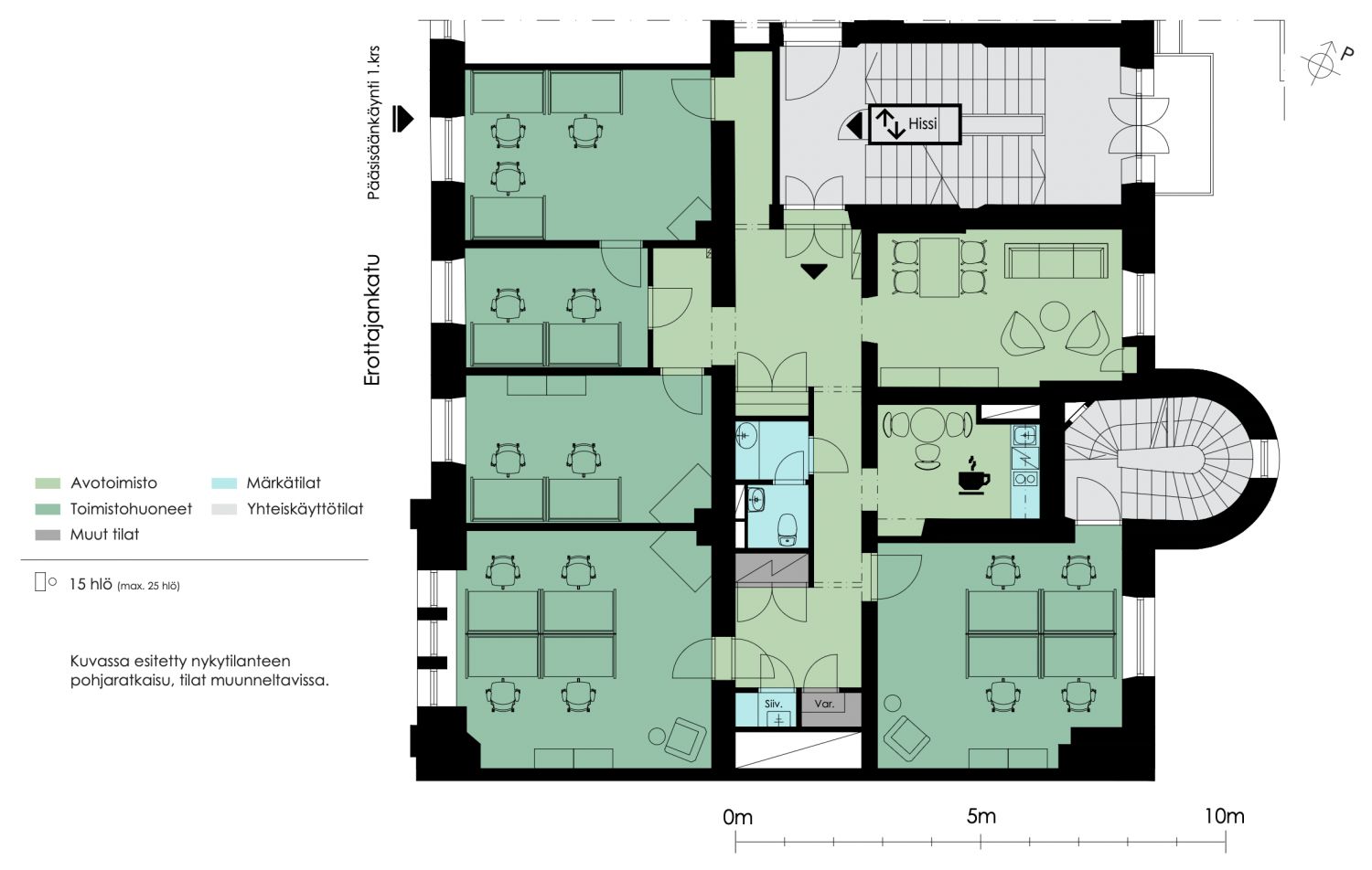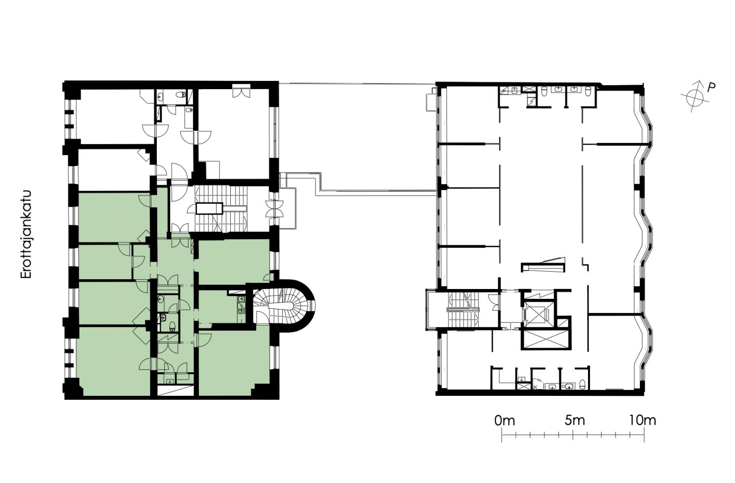 Erottajan puoleisen rakennuksen 5. kerroksen hyväkuntoinen, tyylikäs ja valoisa toimistotila, josta on upeat näkymät Diana-puistoon. Tilan erikoisuutena on kolme jugend-tyylistä kaakeliuunia. Oheisessa pohjakuvassa on nykytilanteen mukainen tilajako.