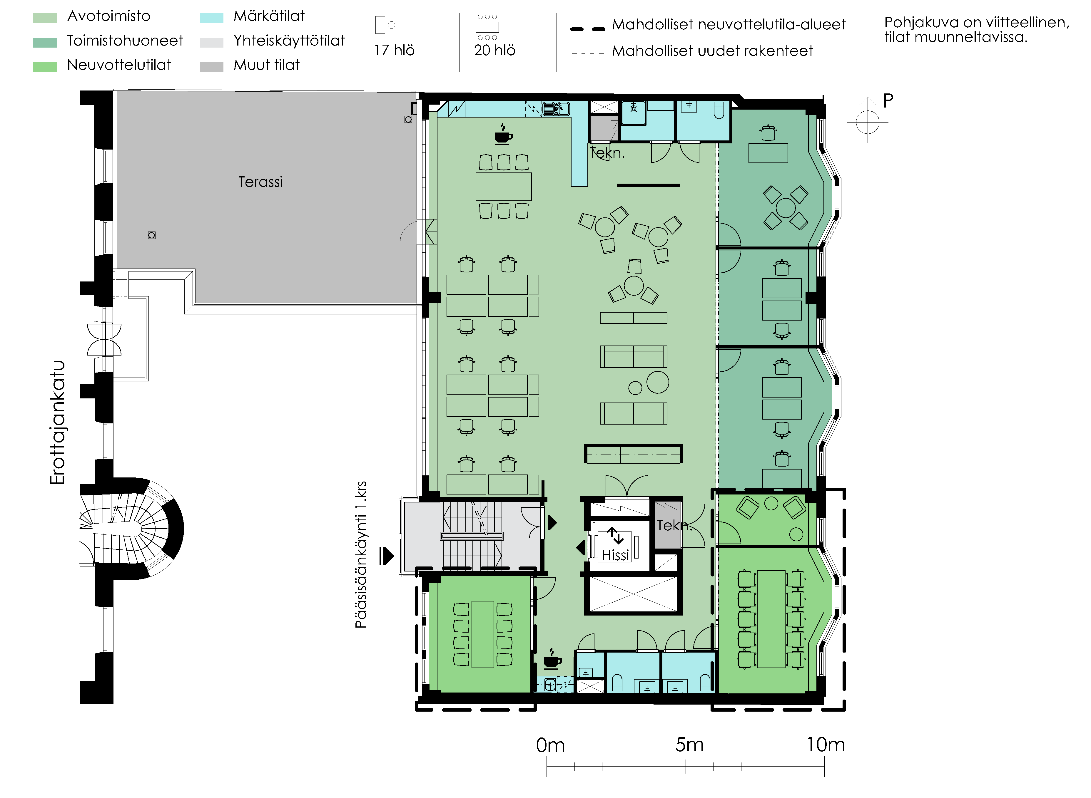 Erittäin siisti, remontoitu avotoimisto, jossa on erillisiä kokoushuoneita ja oma ulkoterassi. Myös talon rappuaula on vastaremontoitu.