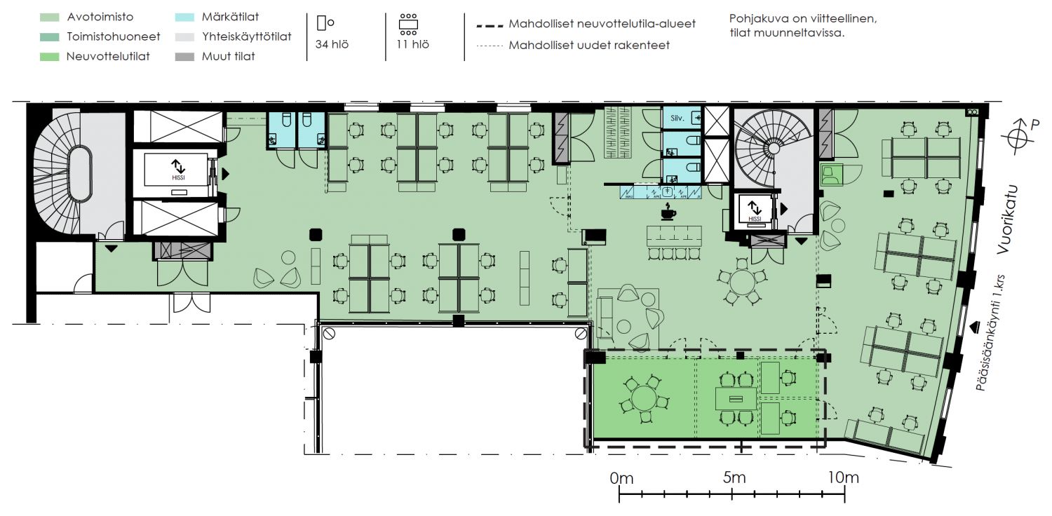 Siisti toimistotila, jossa avotilaa, mutta muutöstöillä jaettavissa huoneiksi tarvittaessa. Fennia-korttelin kattavat palvelut.