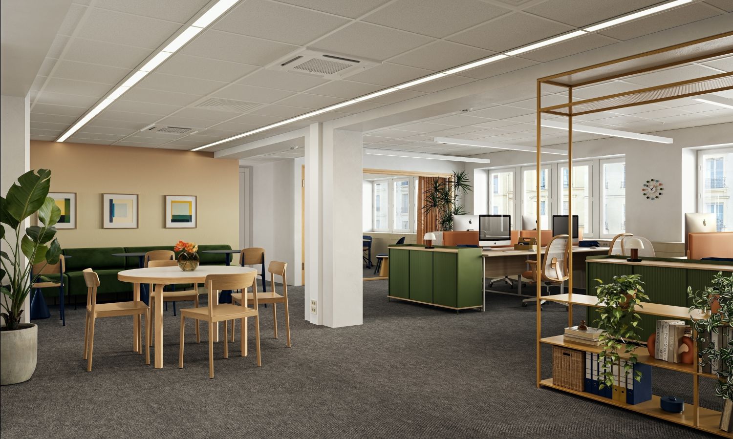 Ilmastoitu, valoisa toimistotila ylimmässä kerroksessa.