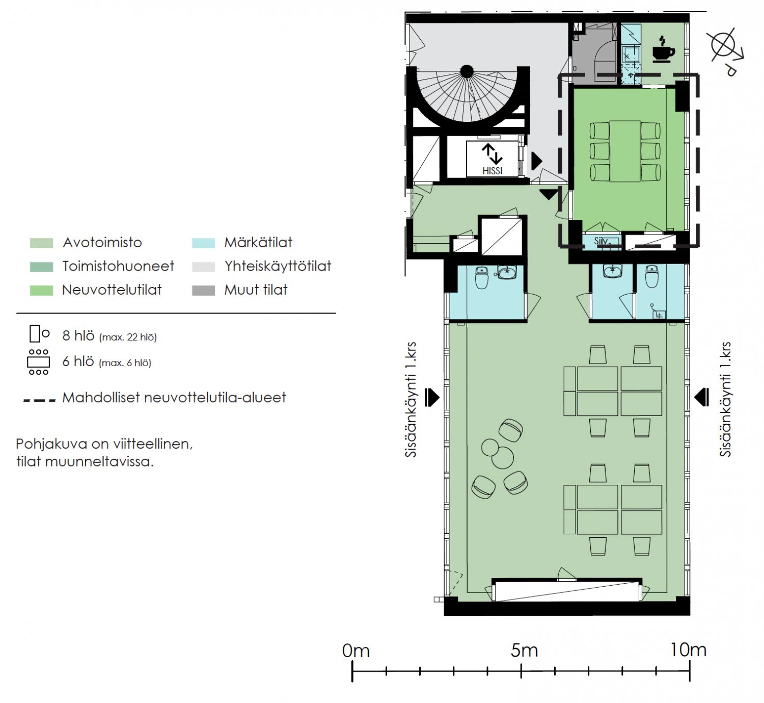 Tilat sopivat keskeistä sijaintia sekä tehokkaasti toteutettuja neliöitä etsivälle yritykselle. Muuntelukelpoiset tilat voidaan toteuttaa yrityksen tarpeiden mukaisesti. Kiinteistössä on vuokrattavissa toimistotilaa 3 380 m² ja liiketilaa 769 m². Lisäksi pohjakerroksesta on mahdollista vuokrata varastotiloja.