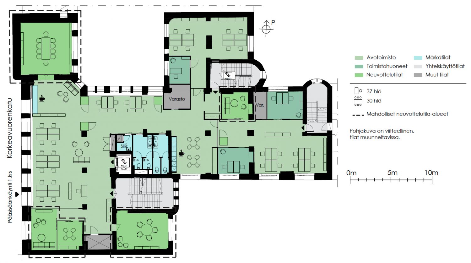 Hyväkuntoinen monitilatoimisto tunnelmallisessa jugendlinnassa. Tilavat, valoisat ja korkeat huoneet.