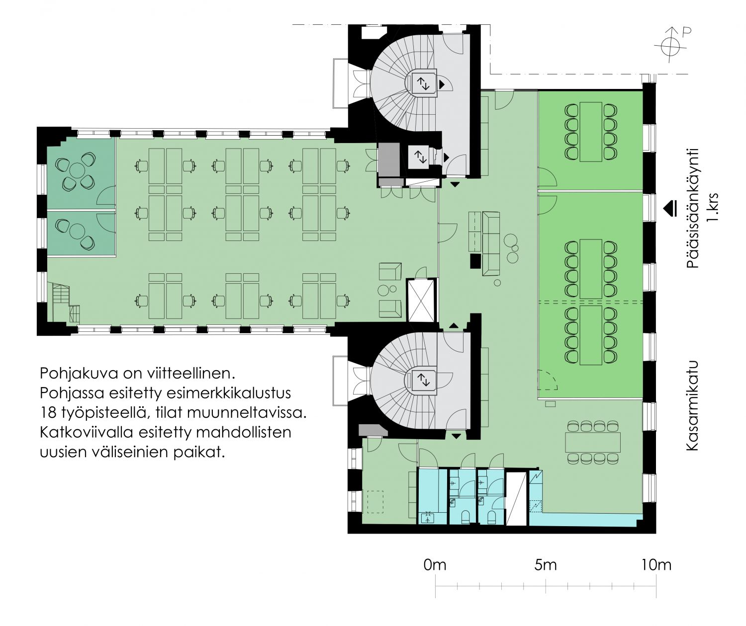Keskeisellä mutta rauhallisella paikalla sijaitsevia nykyaikaisia toimistotiloja historiallisen Kasarmitorin laidalla.