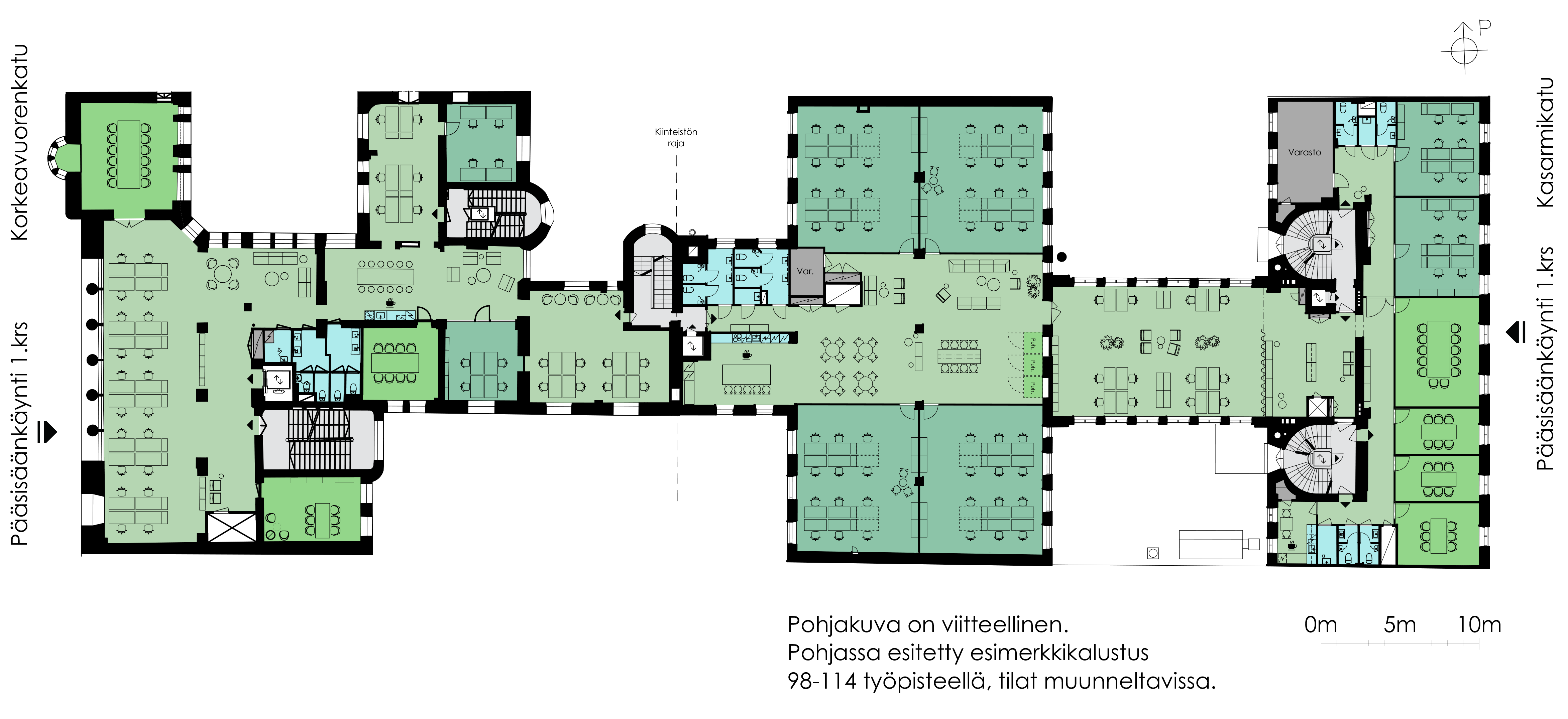 Monikäyttöistä toimistotilaa, jossa mahdollista yhdistää Kasarmikatu 36, 5.krs 831m² tila ja Korkeavuorenkatu 35, 3.krs 511m² tila yhdeksi 1 342m² tilakokonaisuudeksi.