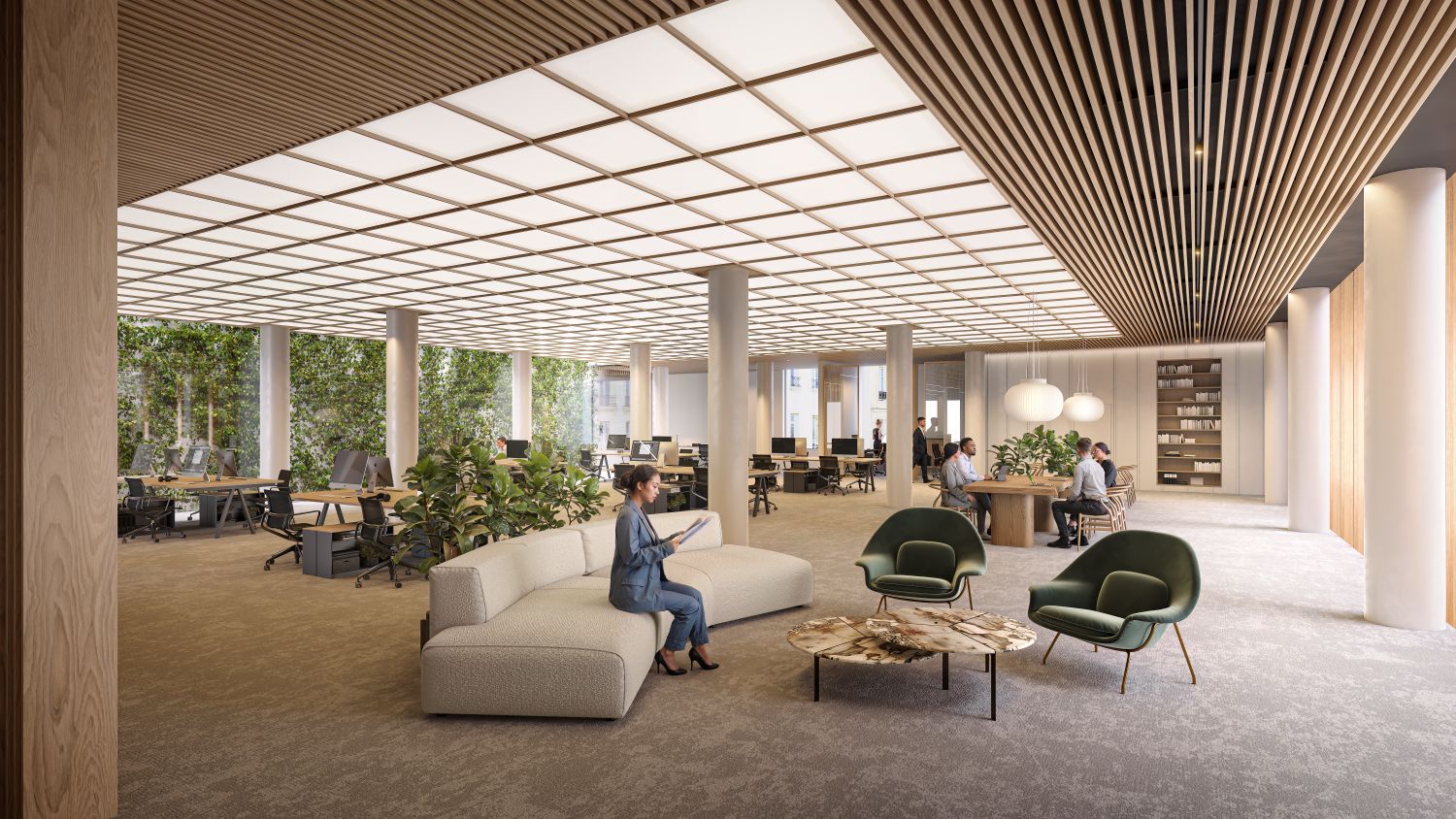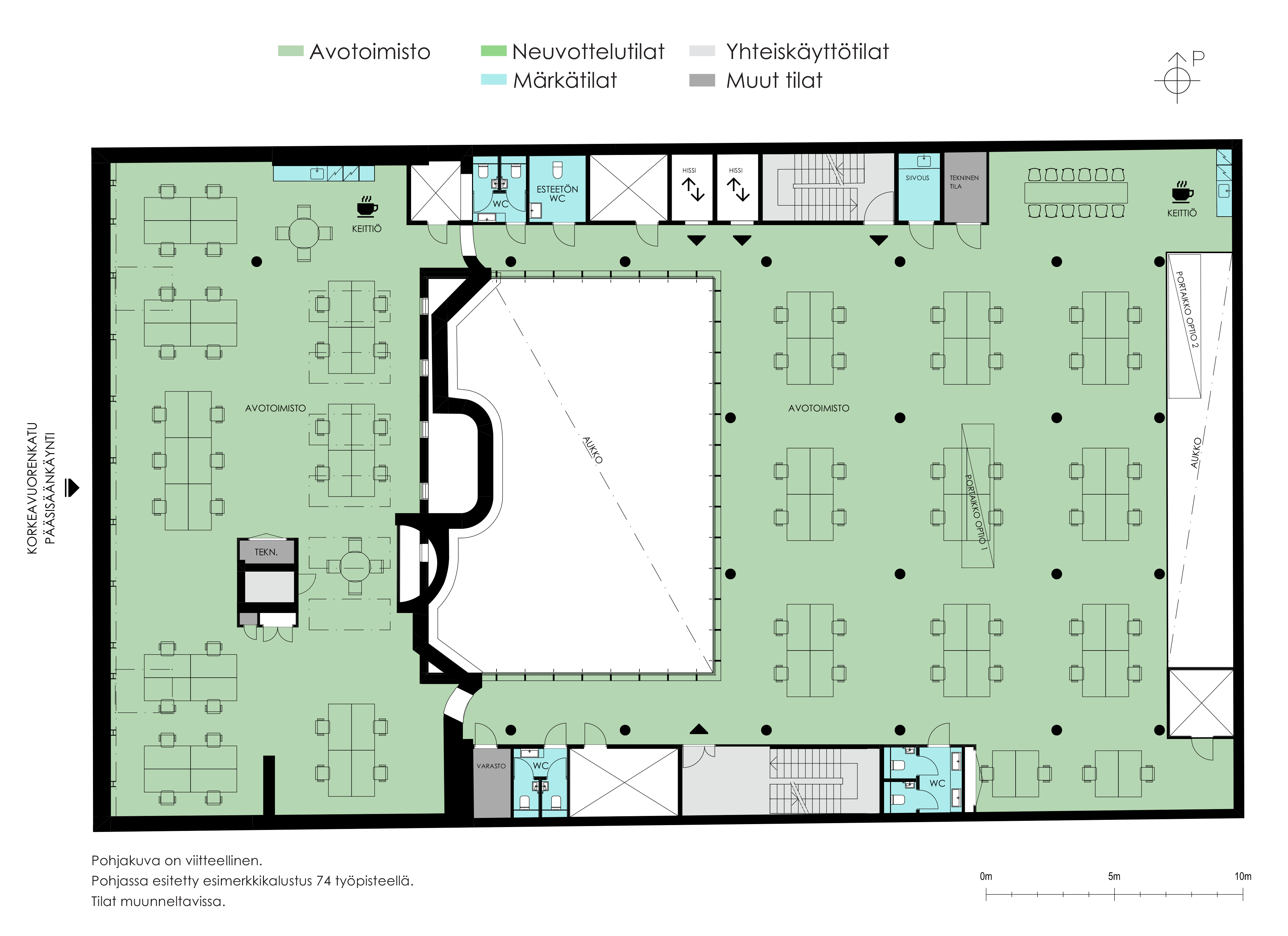 5. kerroksen muuntojoustavaa toimisto- ja neuvottelutilaa. Tilojen välille on mahdollista rakentaa näyttävä sisäporras. Keskellä kerrosta oleva atrium tuo tiloihin lisää luonnonvaloa. Tilaratkaisut toteutetaan toiveiden mukaan.