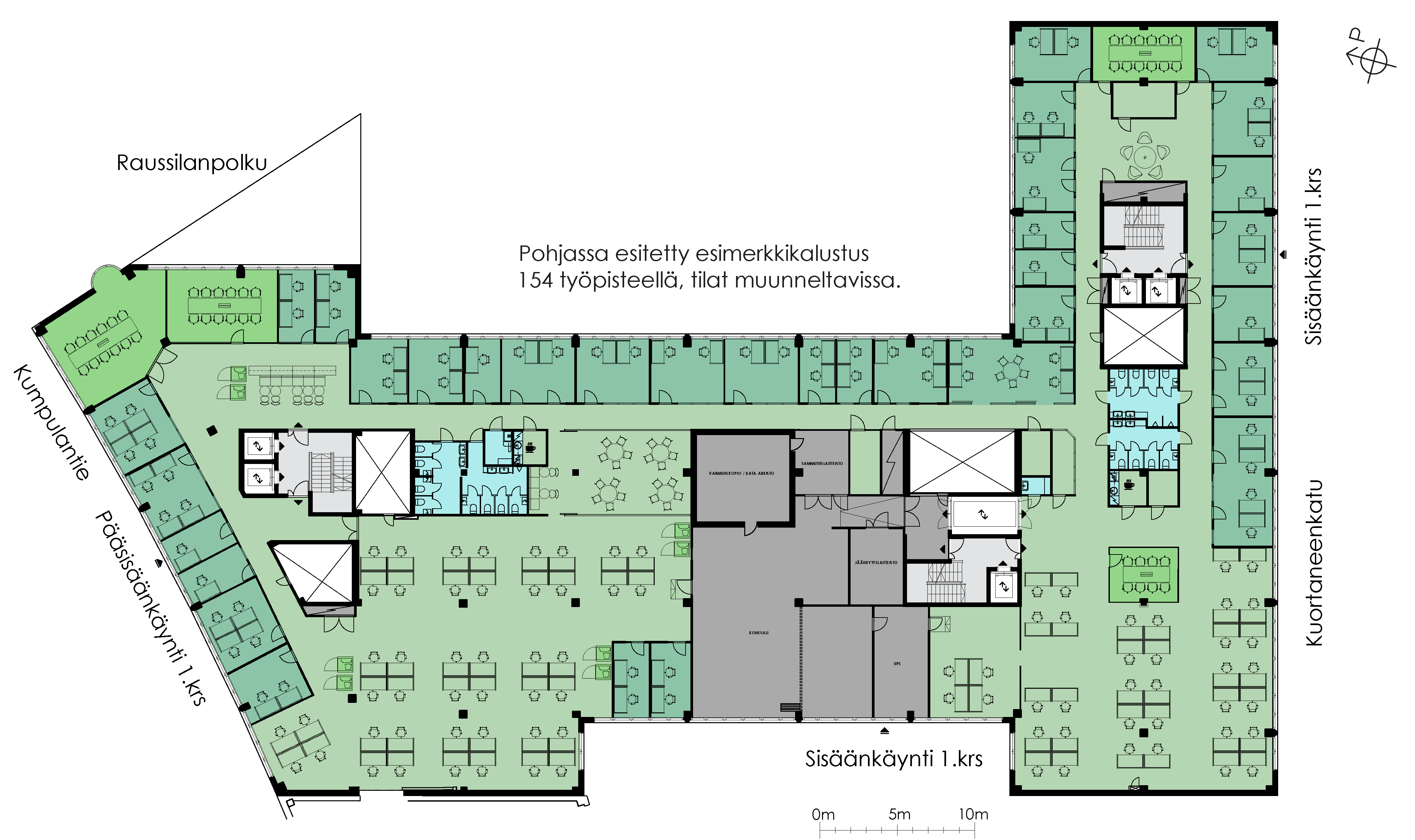 Viisikerroksinen kohde tarjoaa mahdollisuuden tehokkaiden hybriditilojen, yksityisten työhuoneiden tai yhteisöllisten avotilojen rakentamiseen. Valoisiin tiloihin mahtuu työskentelemään jopa 500–750 henkilöä. Kohteen valtteja ovat hieno auditoriotila ja loistavat tavarankuljetusmahdollisuudet. Entisessä teknologiatalona kohteessa on myös erinomaiset tietoliikenneyhteydet.