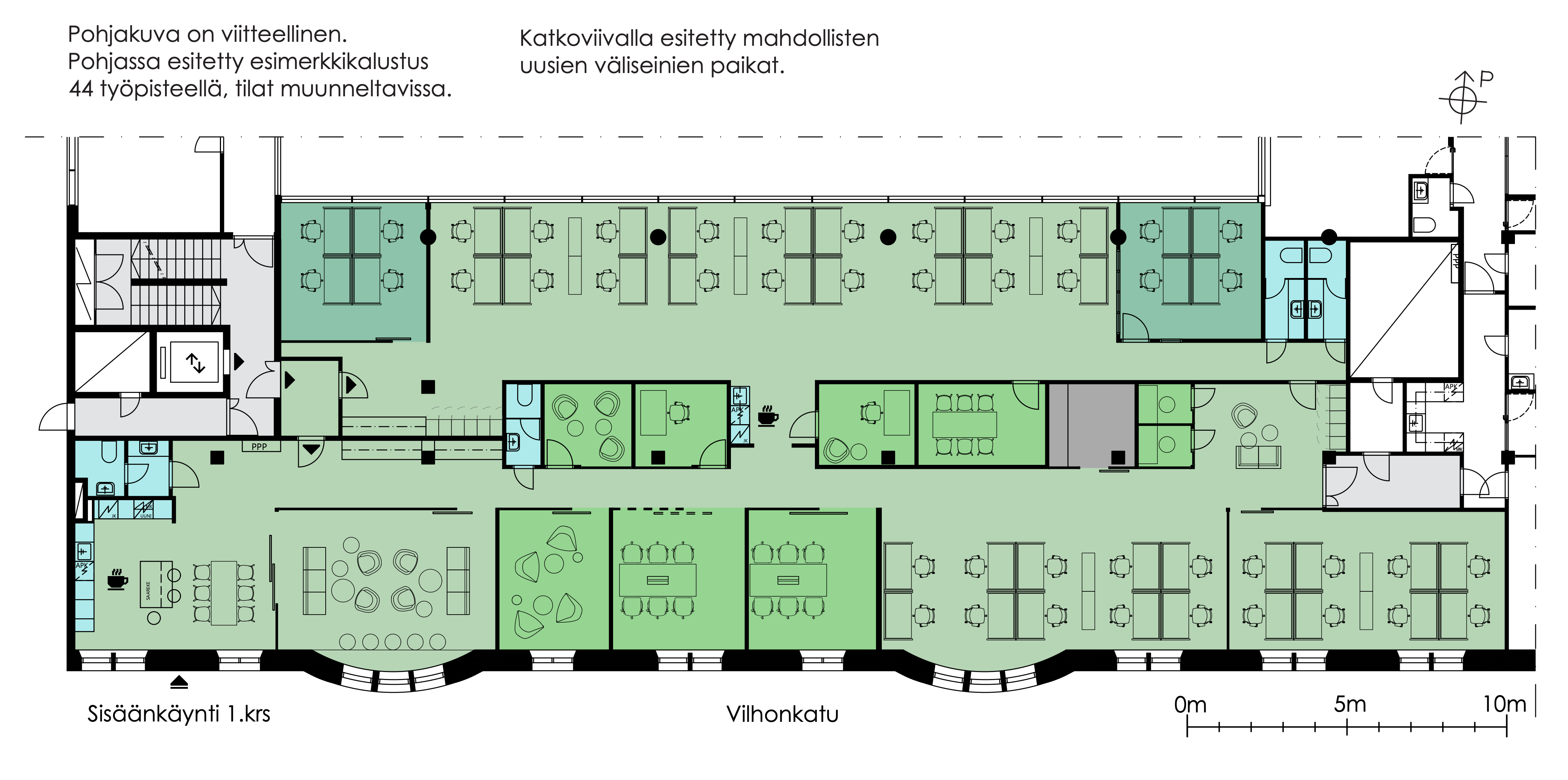 Vuonna 1921 valmistunut kiinteistö sopii hyvin keskeistä sijaintia ja arvokasta miljöötä kaipaavalle yritykselle. Osassa tiloista on upeita, historiaa henkiviä yksityiskohtia, kuten uniikki kulmaneuvottelutila ja korkeat huoneet. Tilat on tekniikaltaan ja jäähdytykseltään saneerattu moderniin toimistokäyttöön ja ne ovat helposti muunneltavissa yrityskohtaisesti. Katutasossa on liiketiloja ja ylemmissä kerroksissa toimistotilaa.