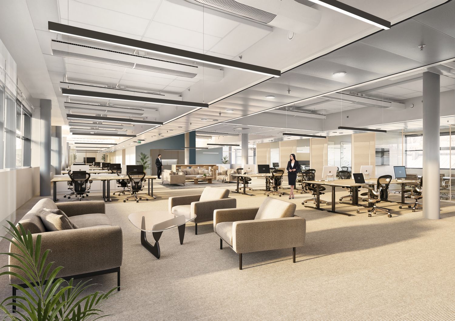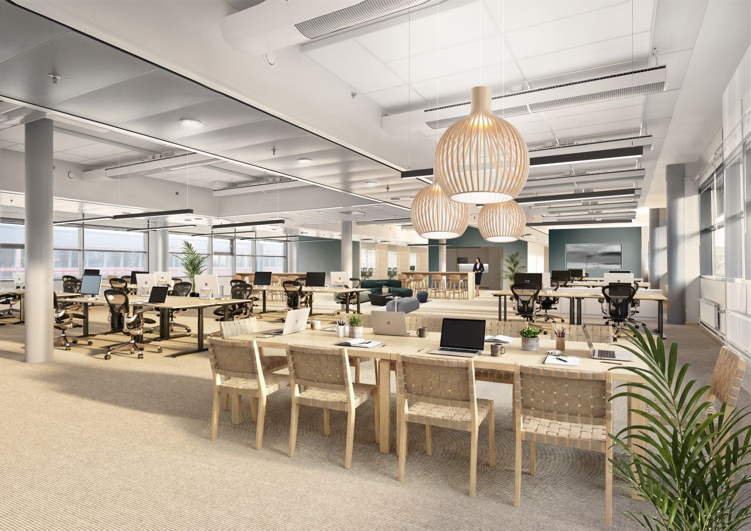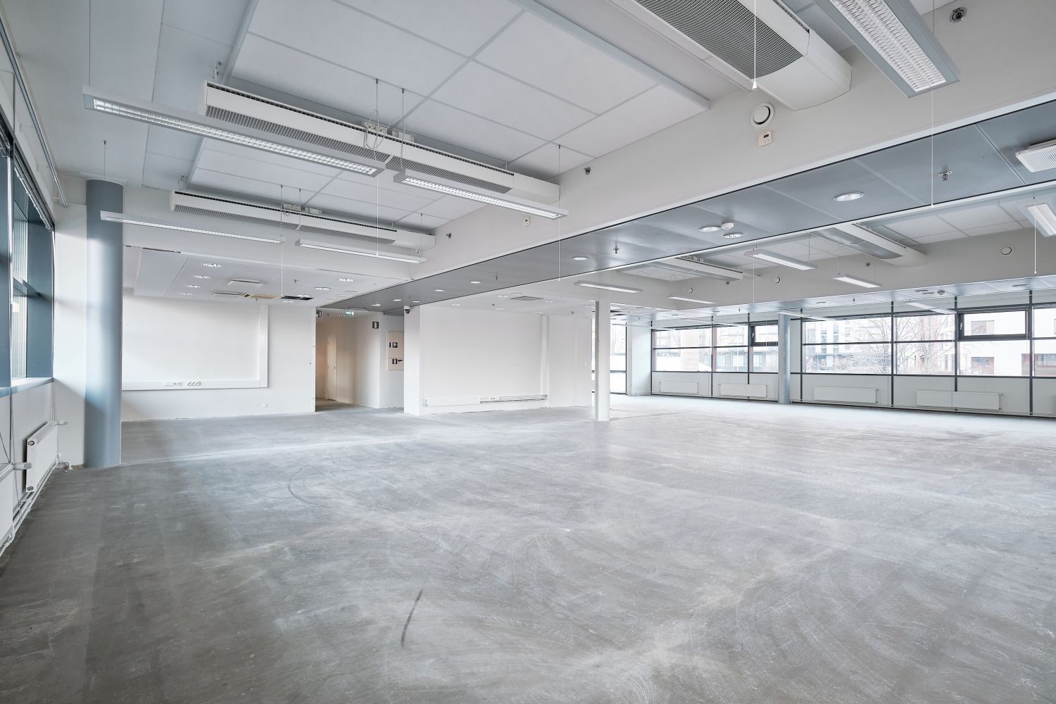 Valoisaa ja avaraa toimistotilaa keskeisellä paikalla. Tila on pääosin avotoimistoa, jonka mukavuutta lisää huoneilmanjäähdytys.