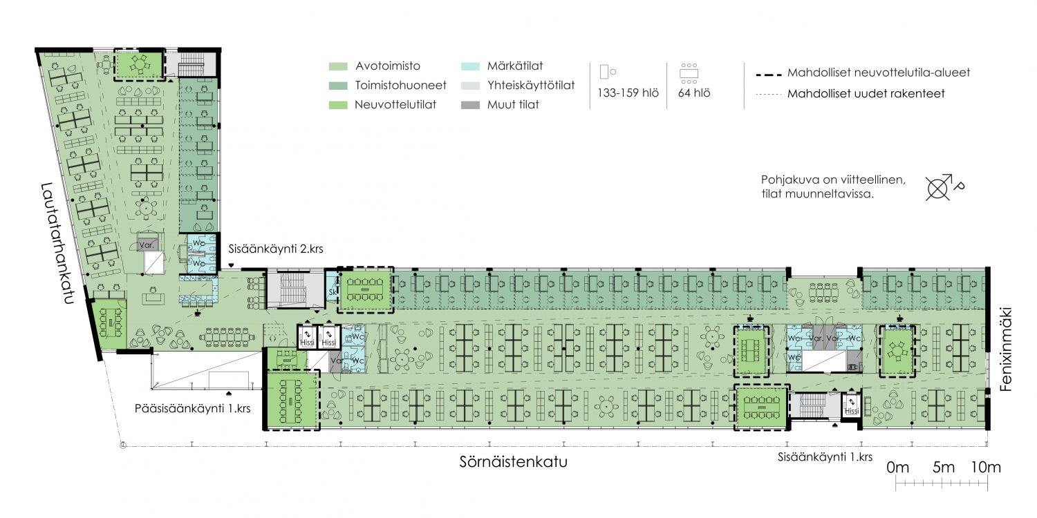 Toimitilavaihtoehtoja on tarjolla pienistä 41 m² toimistohuoneista aina 1800 m² yhden kerroksen kokonaisuuksiin. Isompia toimistokokonaisuuksia on mahdollista jakaa myös noin 270–570 m² palasiin. Toisen kerroksen yhteyteen on mahdollista rakentaa myös kevyttä tuotantotilaa lastauslaiturilla.