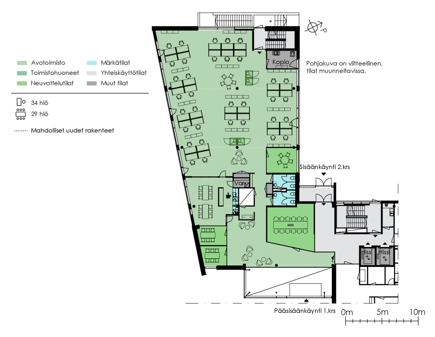 Toimitilavaihtoehtoja on tarjolla pienistä 41 m² toimistohuoneista aina 1800 m² yhden kerroksen kokonaisuuksiin. Isompia toimistokokonaisuuksia on mahdollista jakaa myös noin 260–570 m² palasiin. Toisen kerroksen yhteyteen on mahdollista rakentaa myös kevyttä tuotantotilaa lastauslaiturilla.