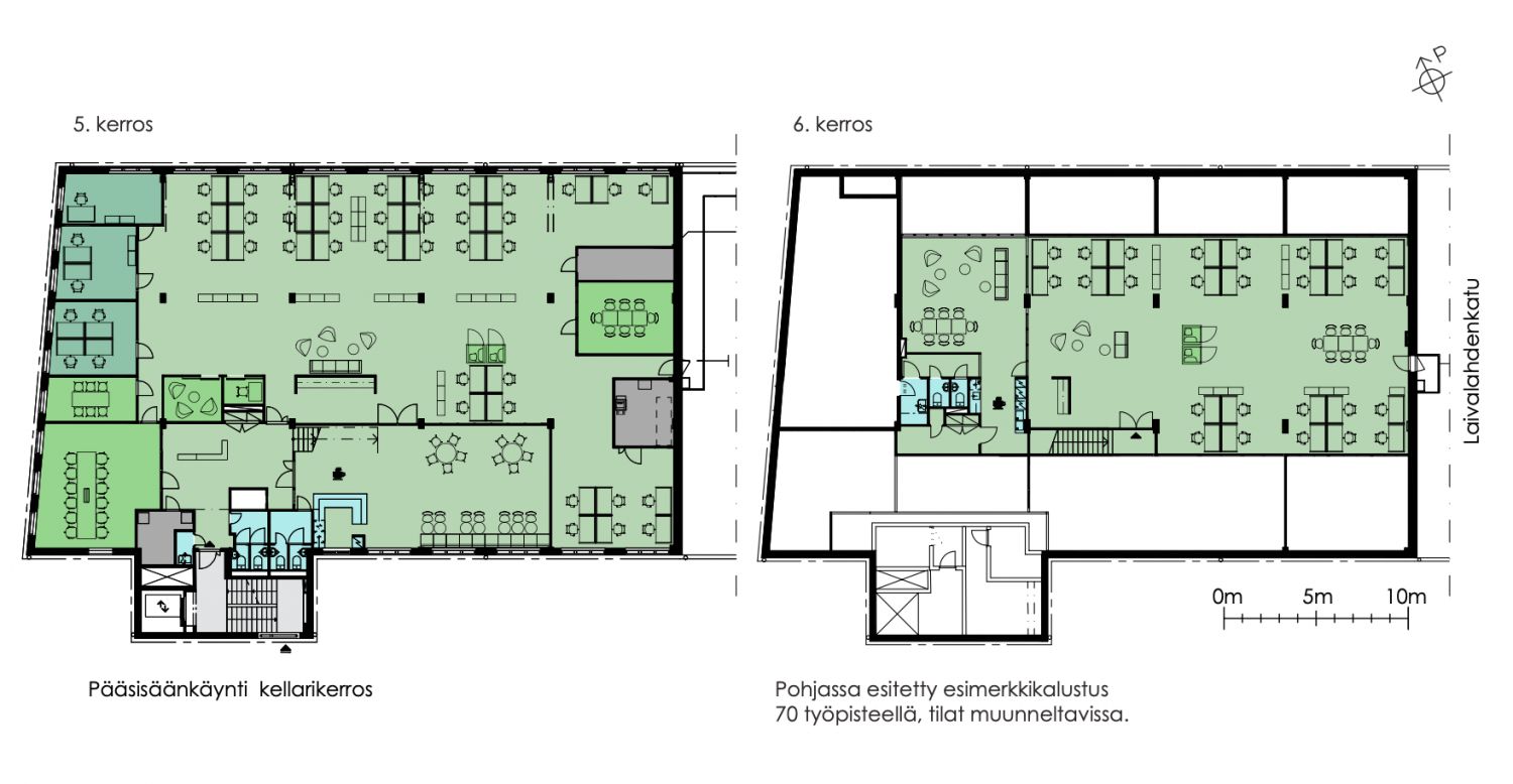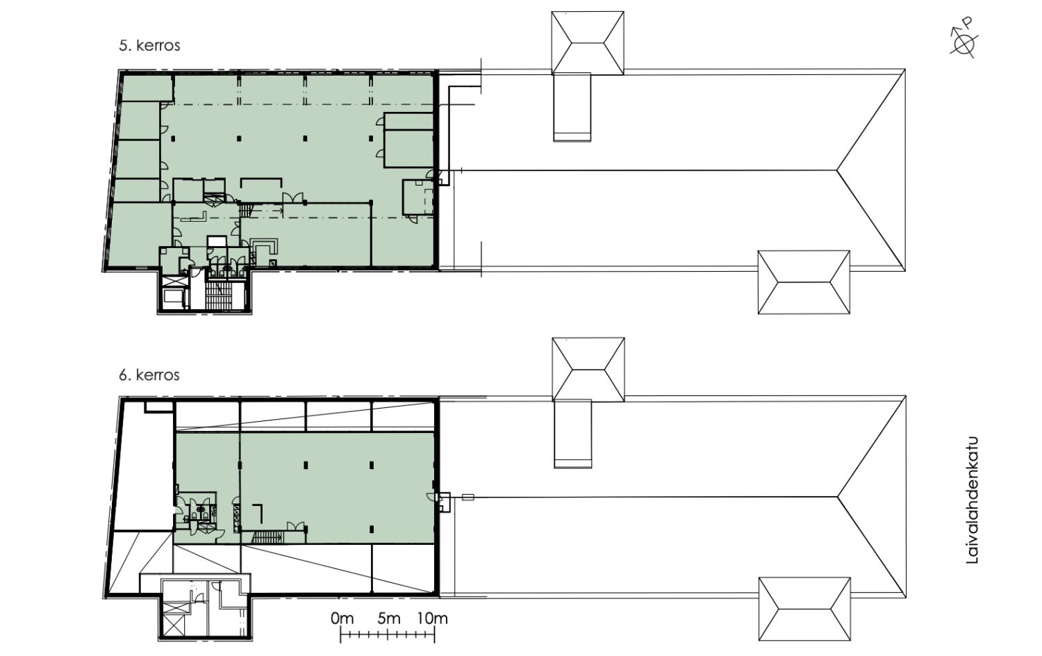 Erittäin valoisa ja avara ylimmän 5.-6. kerroksen toimistotila omalla parvella. Osa tilasta on kuusi metriä korkeaa jäähdytettyä työhuone- ja avotoimistotilaa.