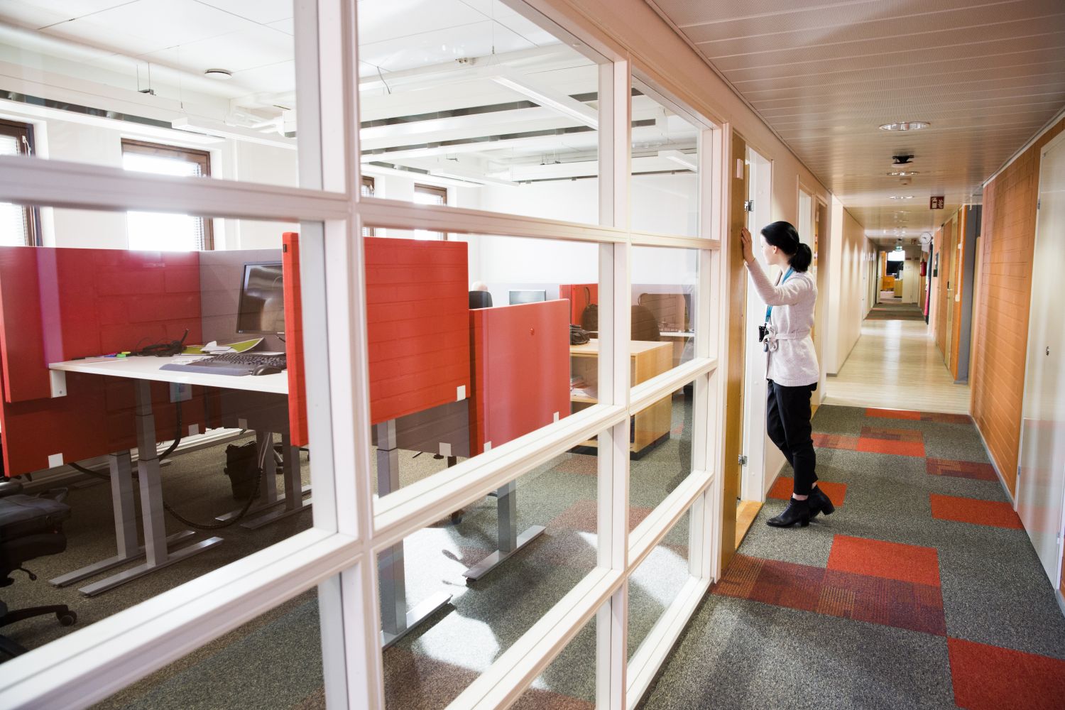 Tässä kuusikerroksisessa toimistorakennuksessa on valoisat avotilat.