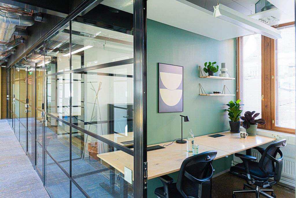 Valoisia, kalustettuja yksityisiä toimistohuoneita koossa 11-20m².