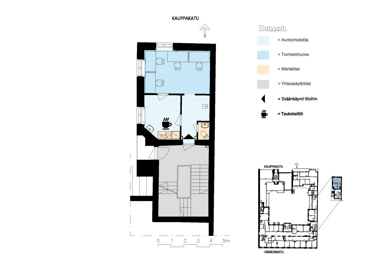 Keskeisellä paikalla oleva liike- ja toimistorakennus sijaitsee Hämeenkadulla Sokosta vastapäätä. Rakennuksen toinen osa sijaitsee Kauppakadun puolella kävelykadun välittömässä läheisyydessä.
