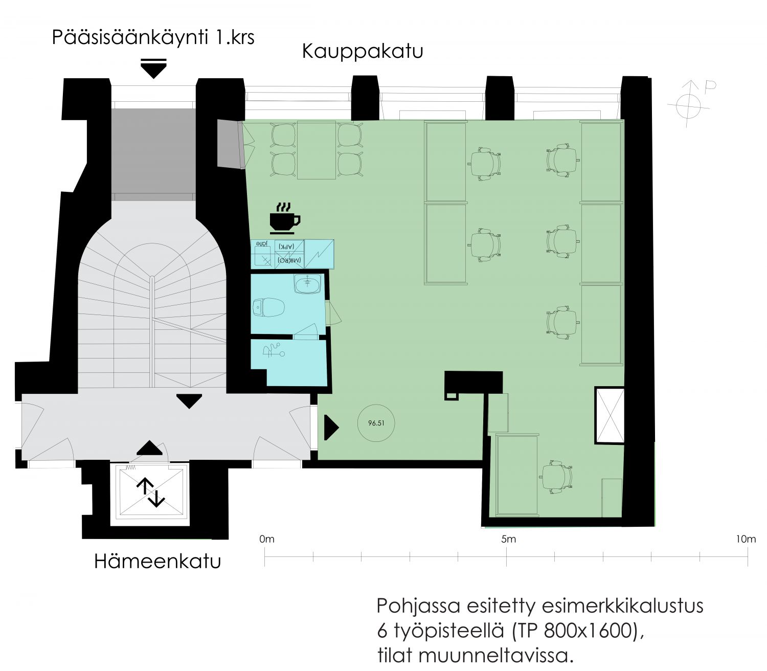 Keskeisellä paikalla oleva liike- ja toimistorakennus sijaitsee Hämeenkadulla Sokosta vastapäätä. Rakennuksen toinen osa sijaitsee Kauppakadun puolella kävelykadun välittömässä läheisyydessä.