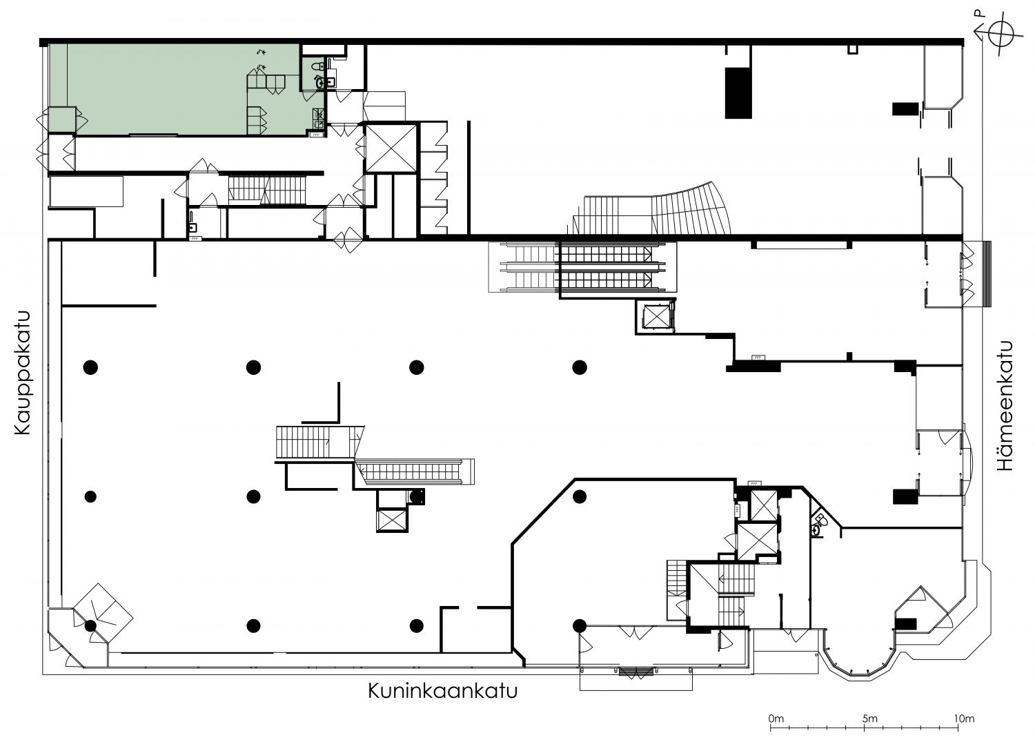 Rakennuksen toinen, Kauppakadun puoleinen osa, sijaitsee erilaisten liikkeiden, ravintoloiden ja muiden palvelujen täyttämän kävelykadun välittömässä läheisyydessä.