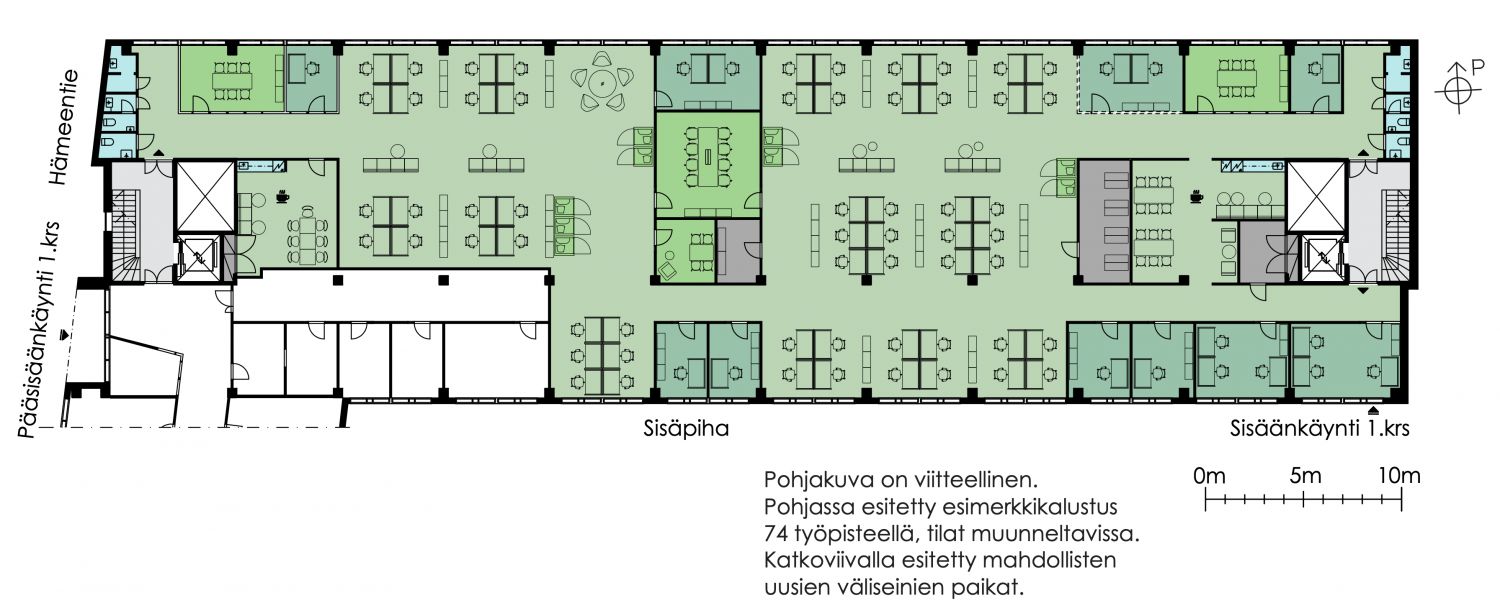 Yhdistelmä huonetoimistotilaa ja avotilaa. Kokonaisuus taipuu moneen käyttöön.