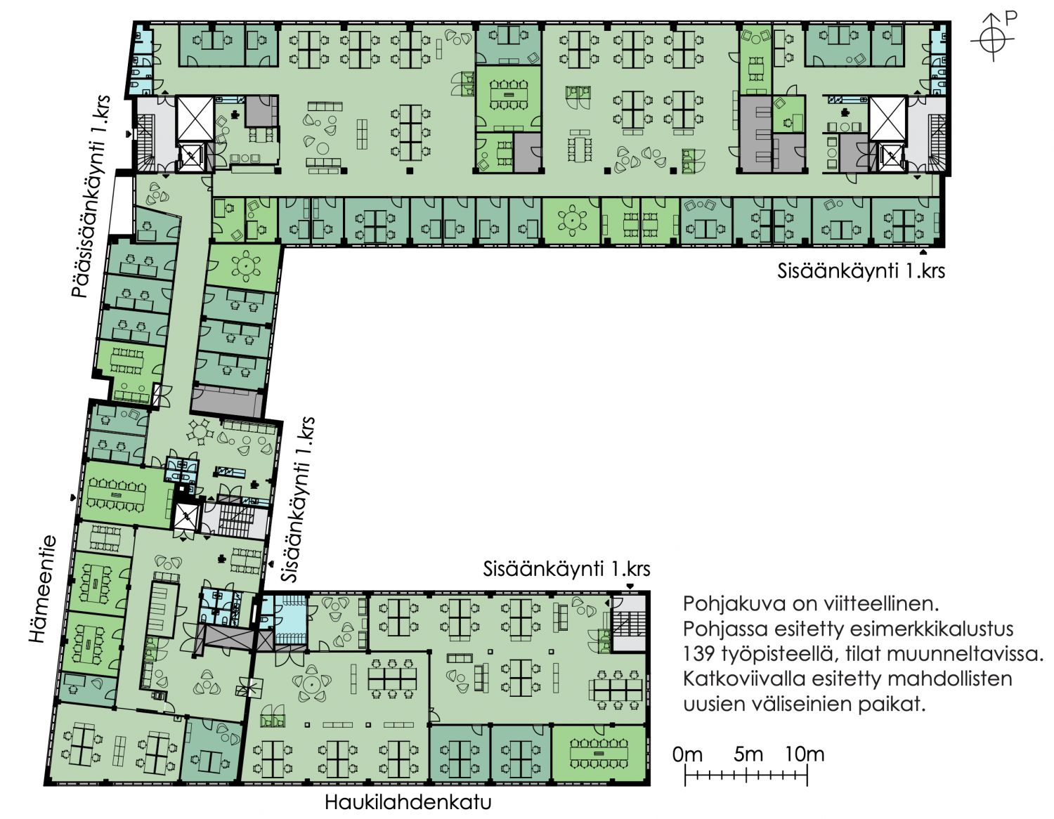 Yhdistelmä huonetoimistotilaa ja avotilaa, joka taipuu moneen käyttöön. Tilaan on tavarahissi yhteys ja neljä sisäänkäyntiä.