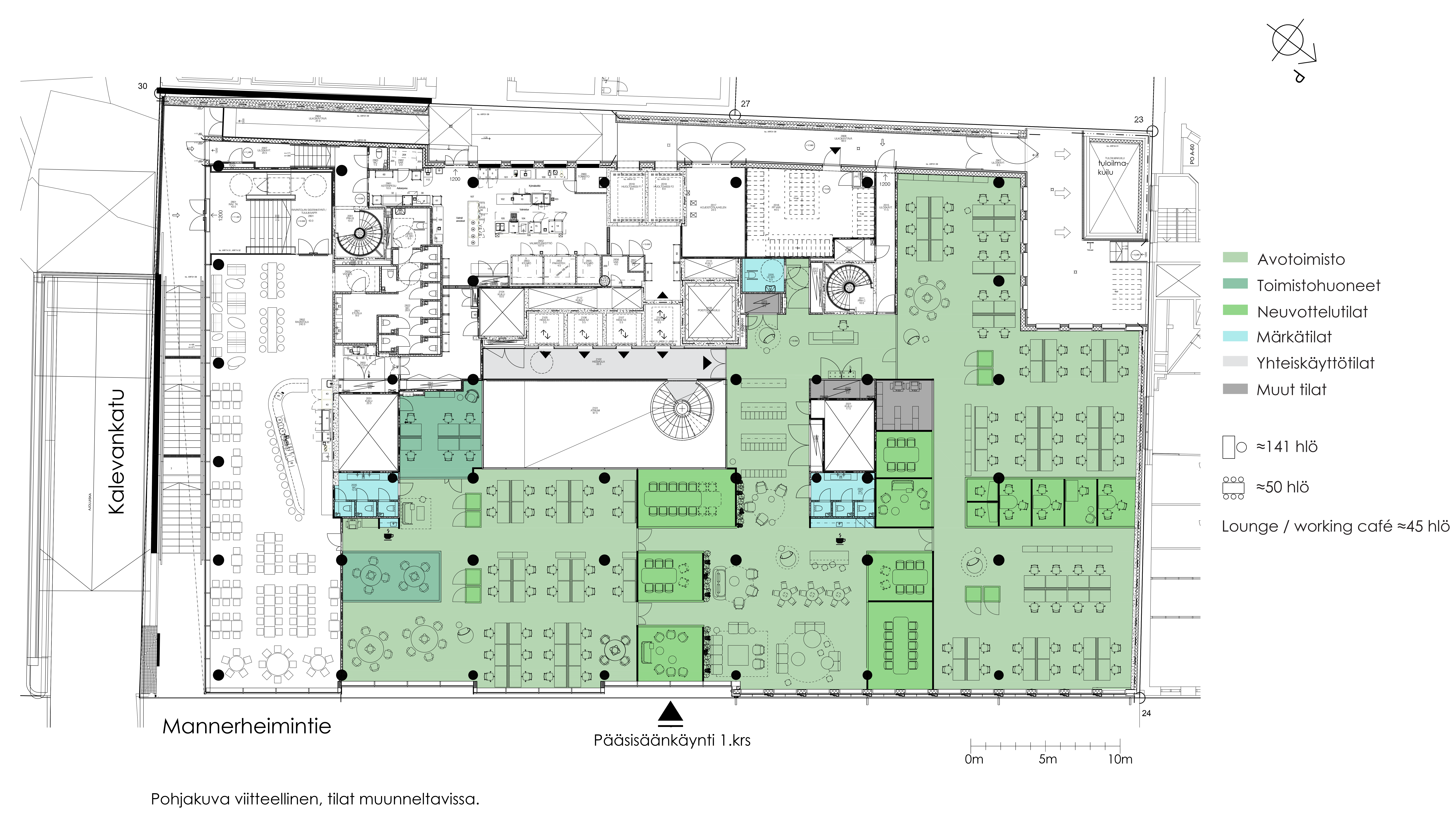 Helposti muunneltavaa ja tehokasta hybriditoimistotilaa Signen toisessa kerroksessa. Tilaratkaisut toteutetaan toiveiden mukaan.