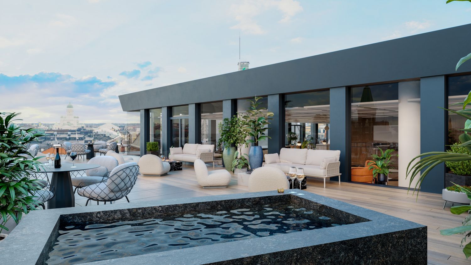 Tehokasta ylimmän kerroksen hybriditoimistotilaa kaupungin parhailla näkymillä. Kerroksessa on oma suurikokoinen terassi, joista avautuvat upeat näkymät kaupungin kattojen ylle. Tilaratkaisut toteutetaan toiveiden mukaan.