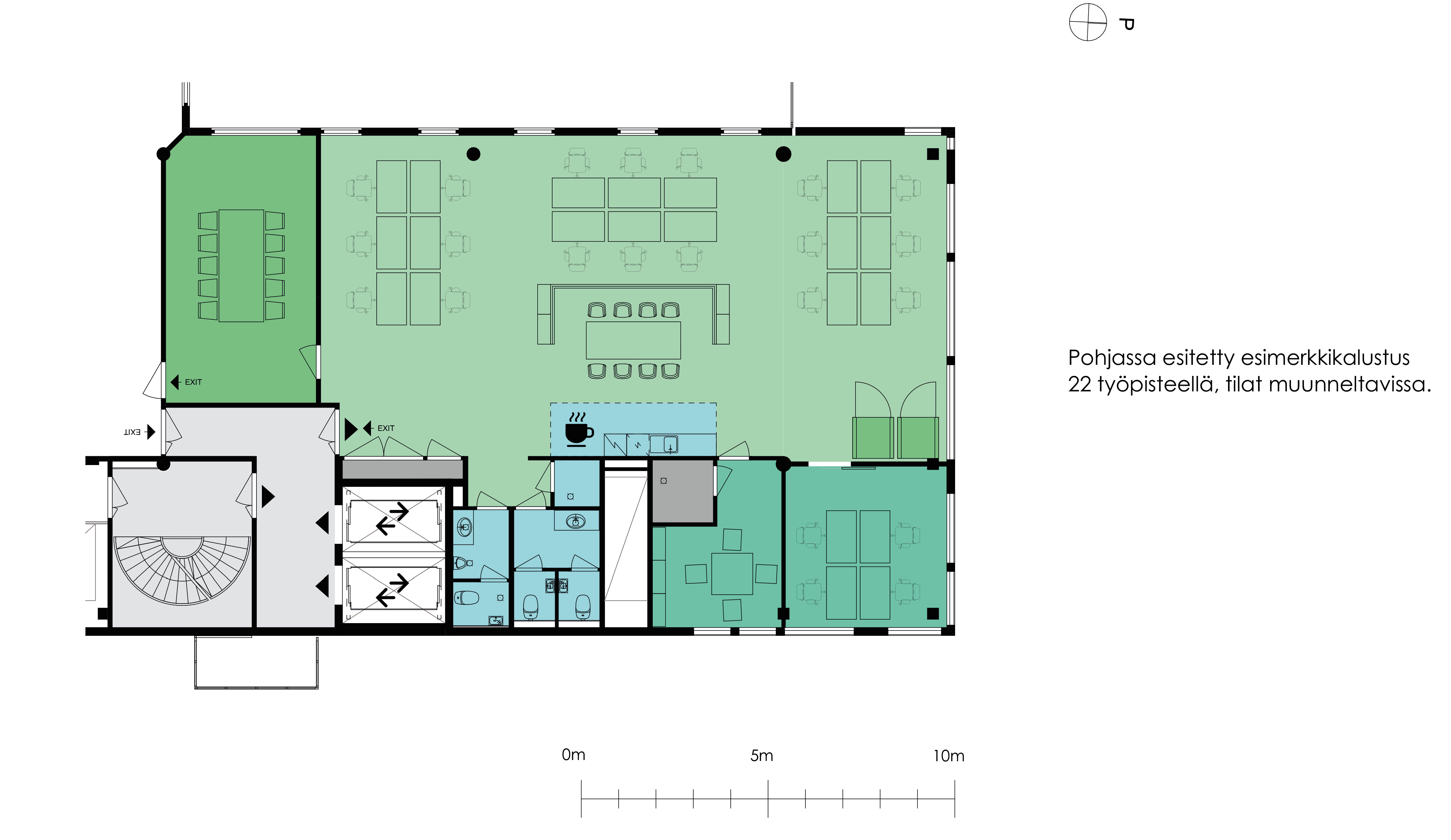 Siisti ja valoisa hybriditoimisto, jossa isoista ikkunoista tulee paljon luonnonvaloa sisään.