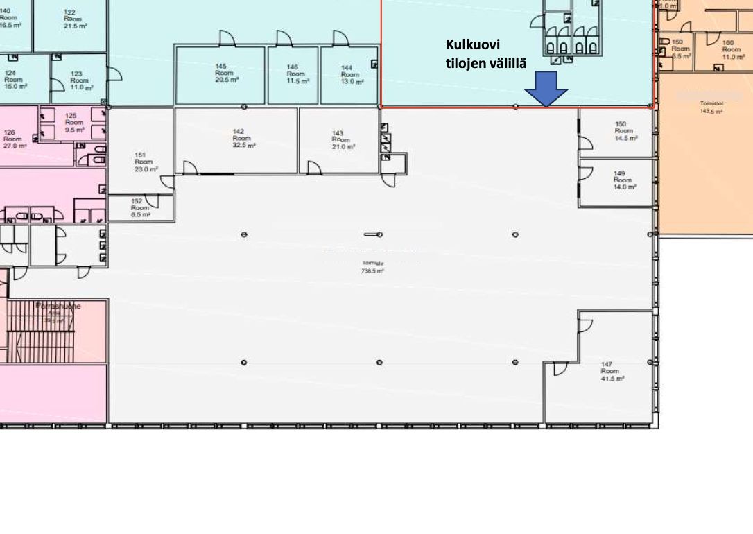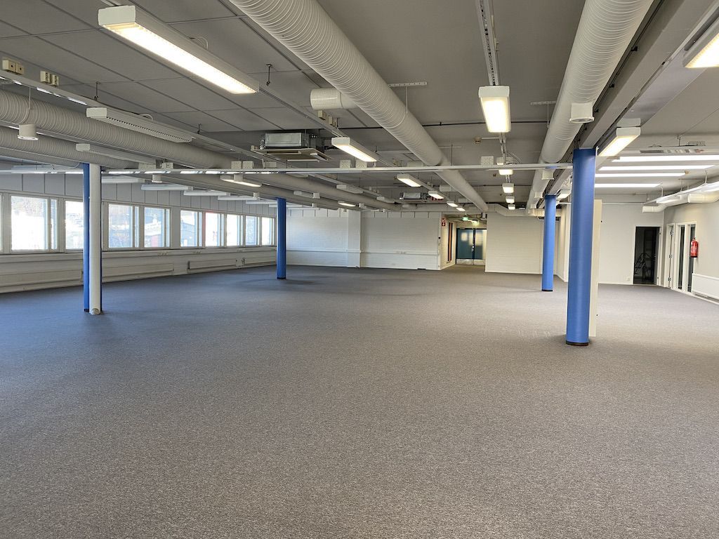 Varastotilasta porrasyhteys 2. kerroksen 737m2 toimistoon. Toimistotilassa on avotilaa, keittiö ja muutama huone.