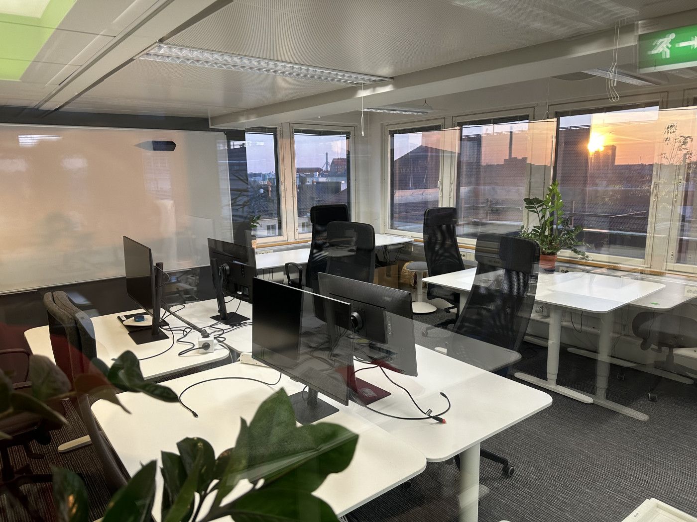 Coworking-tilasta osittain lasiseinällä eroteltu tila, josta on hienot näkymät kattojen yli etelän suuntaan.