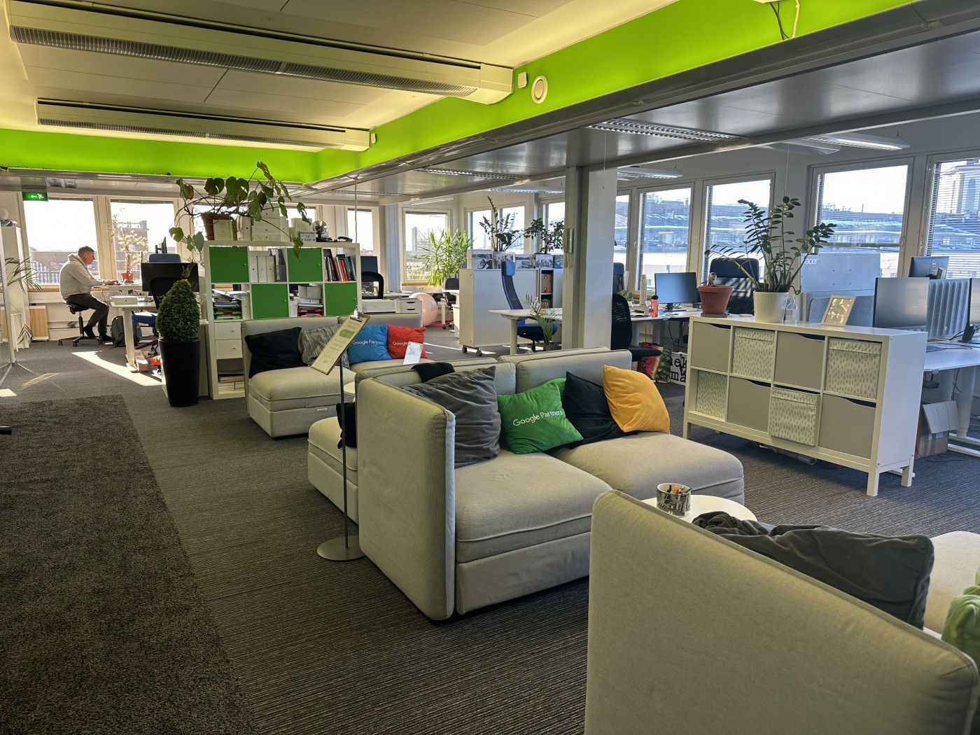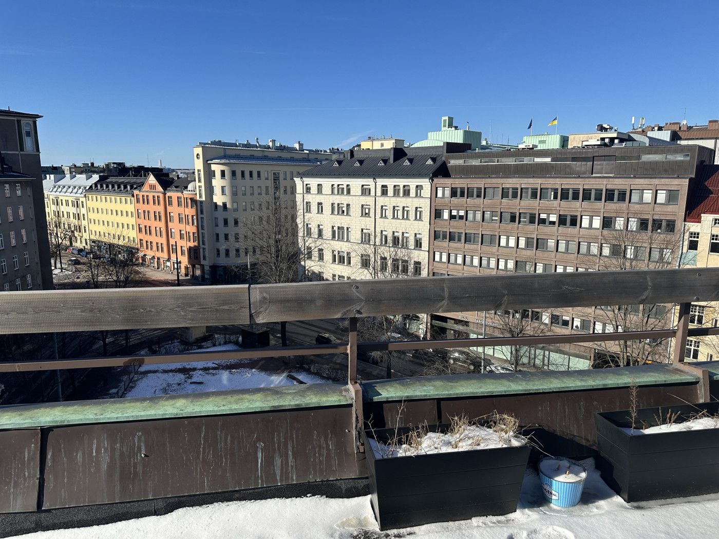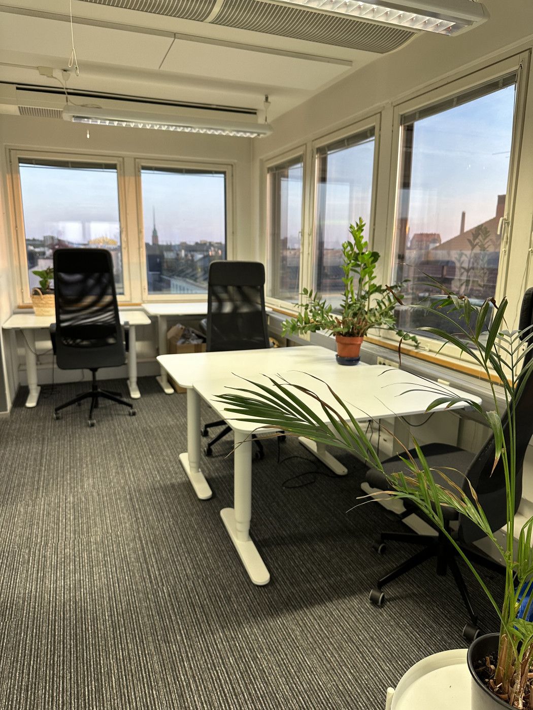 Työpiste Coworking-tilassa rakennúksen 9. kerroksessa, josta on hienot näkymät kattojen yli etelän suuntaan.
