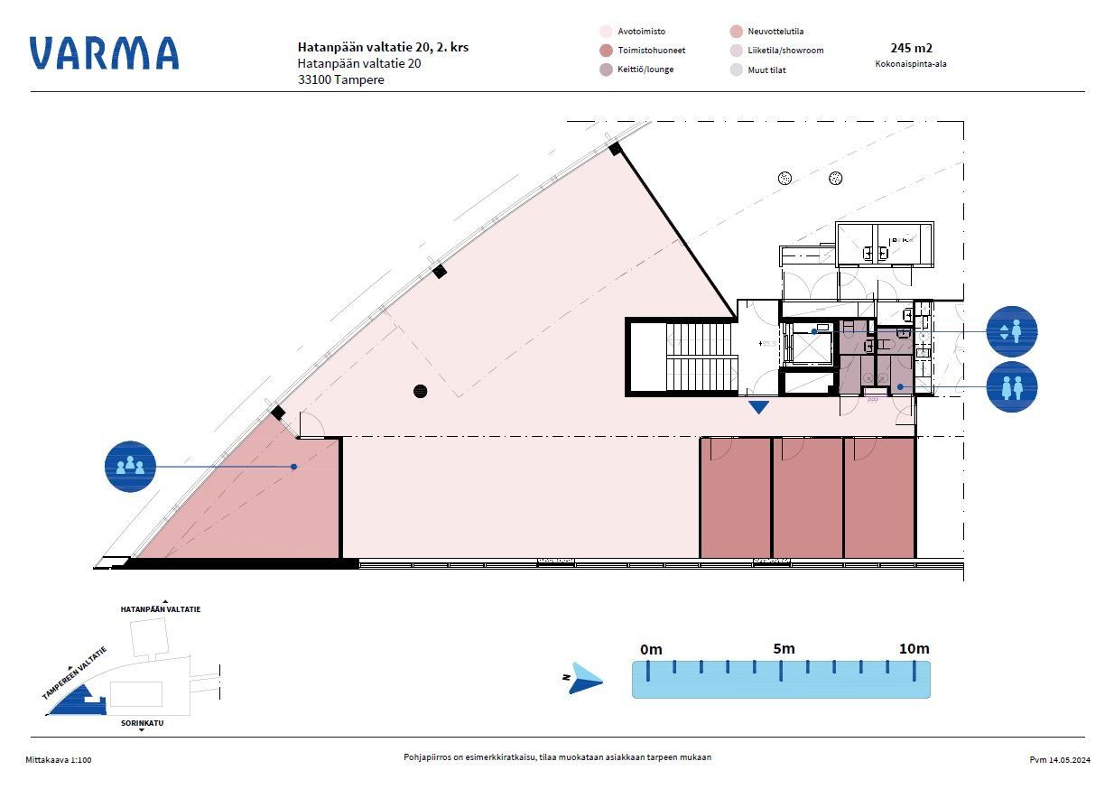 Tunnistettava kaareva toimistotalo sijaitsee hyvällä paikalla Tampereen Ratinassa uuden Nokia Arenan läheisyydessä. Kulkuyhteydet ovat autoilijoille erinomaiset, sillä vierestä kulkevat Hatanpään valtatie ja Tampereen valtatie. Ratikka- tai bussipysäkkikään ei ole kaukana ja Tampereen keskustaan tai rautatieasemalle kävelet reilussa kymmenessä minuutissa. Valoisaa toimistotilaa. Omat wc:t. Pohjaratkaisussa tällä hetkellä avotilaa ja neuvottelu-/työhuoneita.