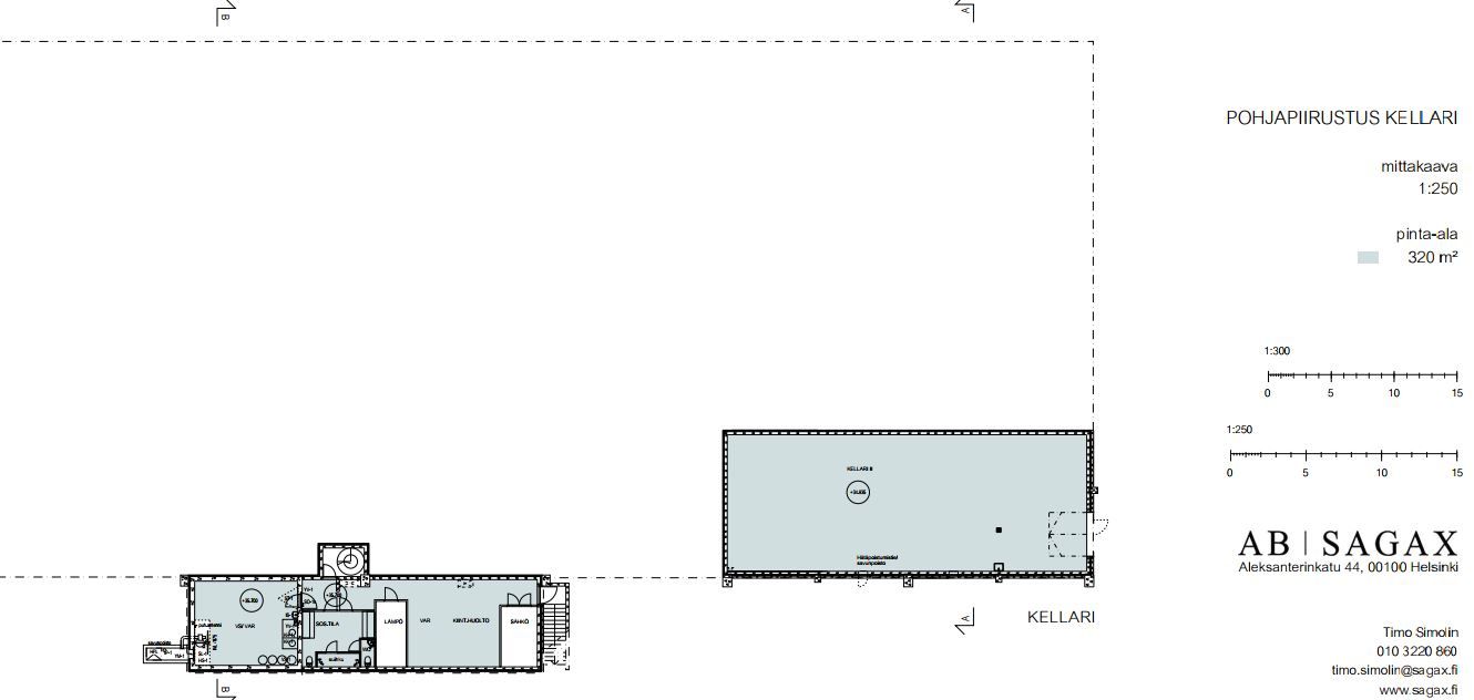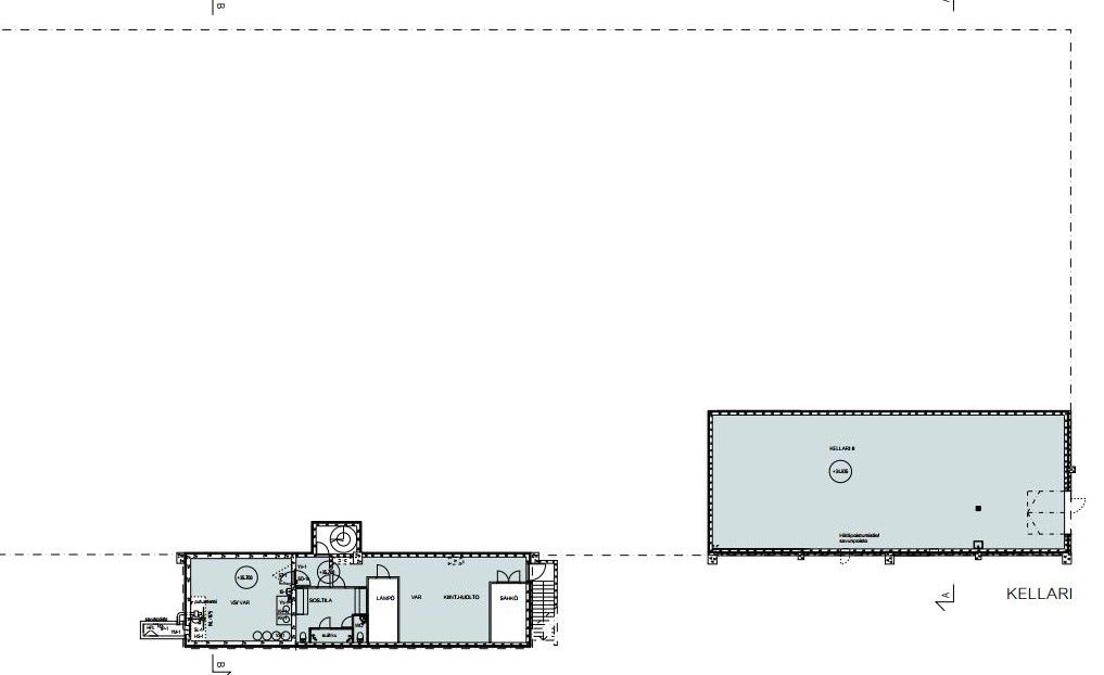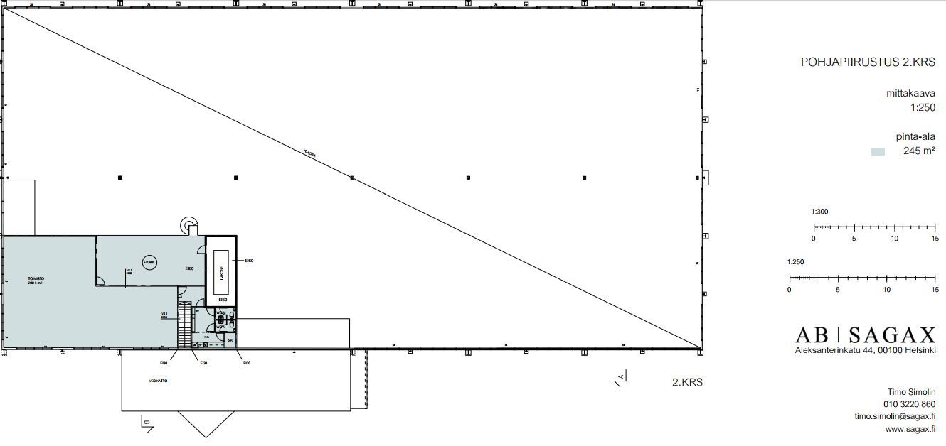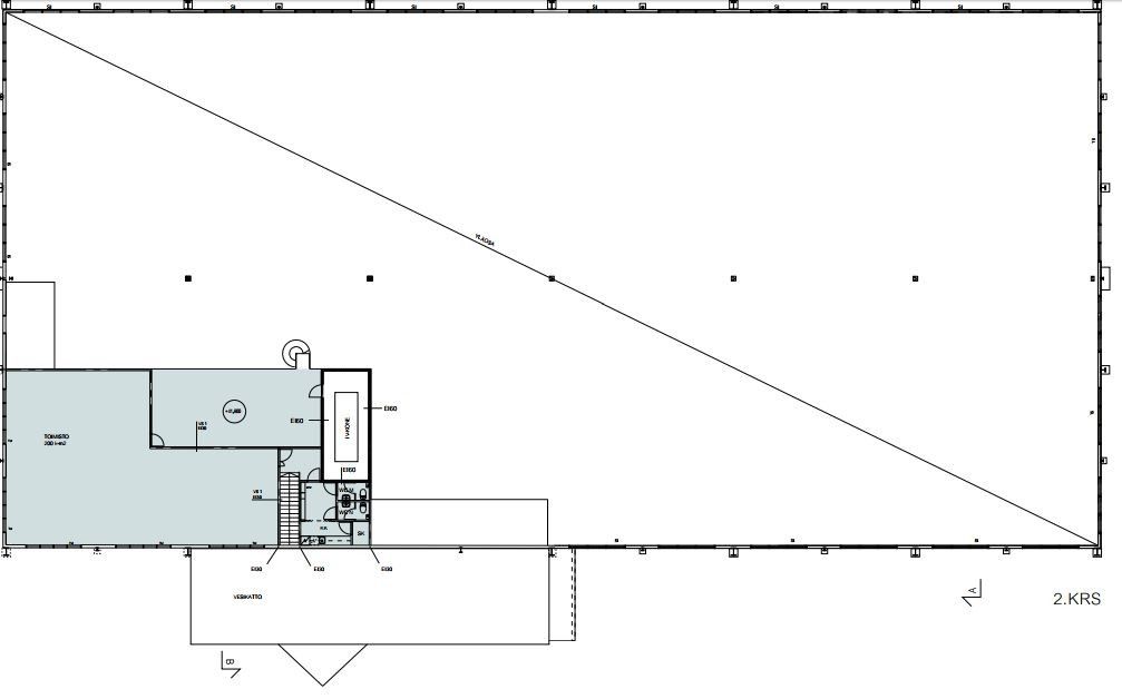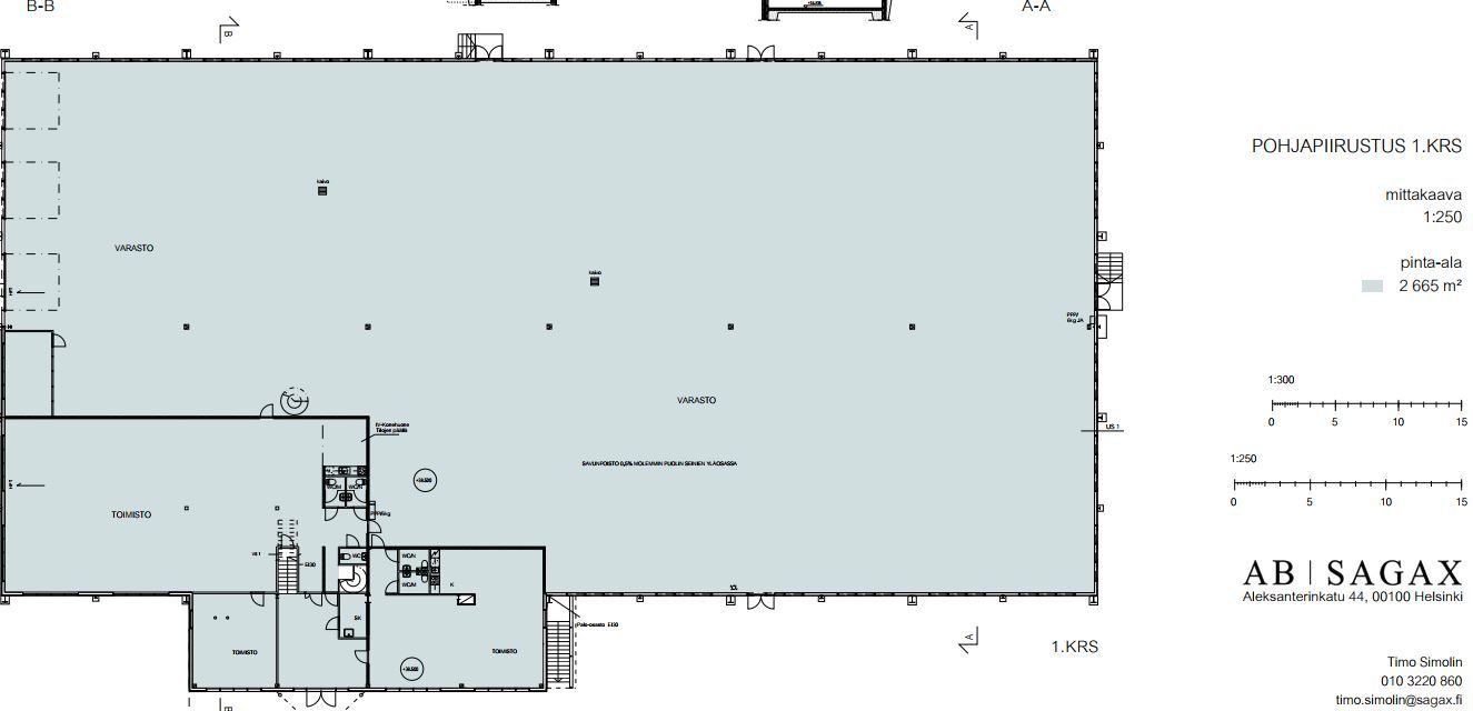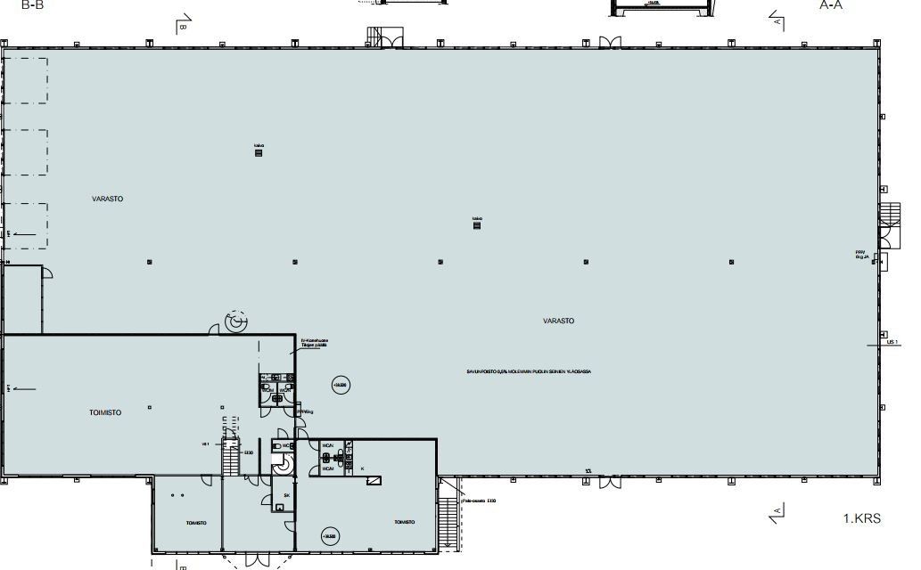 Tilajaotus nykytilanteessa: Varastotilat: n. 2223 m2 (1.krs) Toimistotilat: n. 638 m2 (1. ja 2.krs) Kellari- ja suihkutilat: n. 133 m2 (kellarikerros) Autalli/ erillisvarasto: n. 236 m2 (kellarikerros)