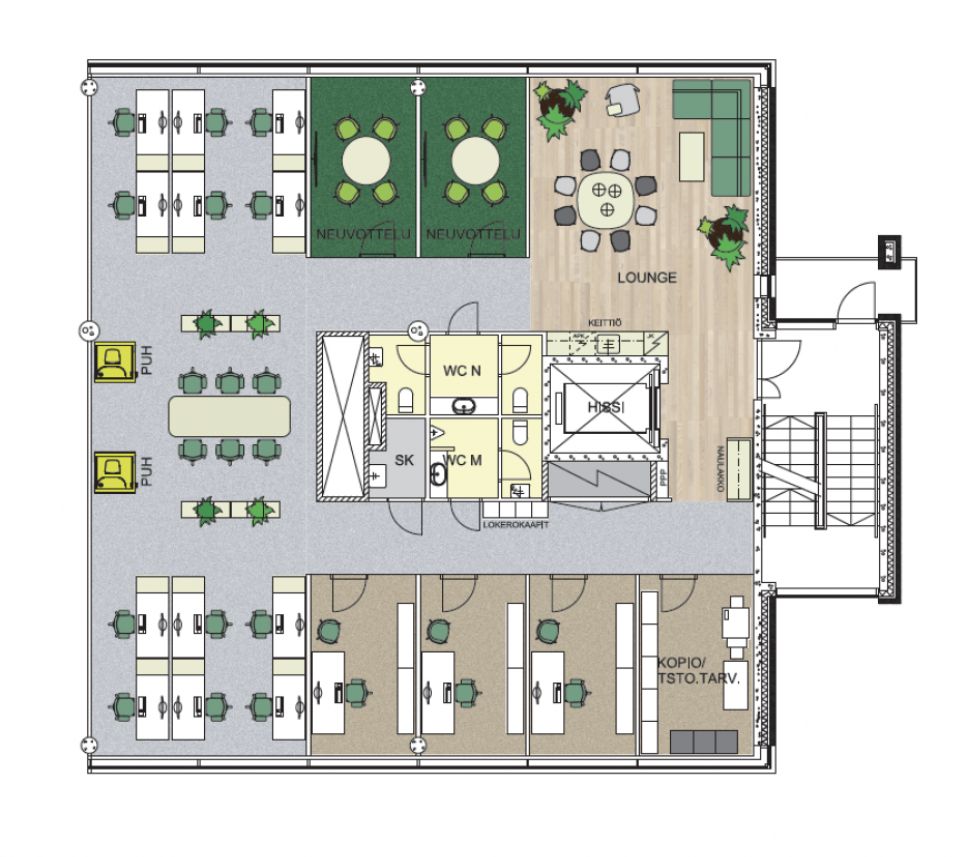 Kaikissa toimistotiloissa on koneellinen jäähdytys ja tilat ovat muunneltavissa vuokralaisen tarpeita vastaaviksi.