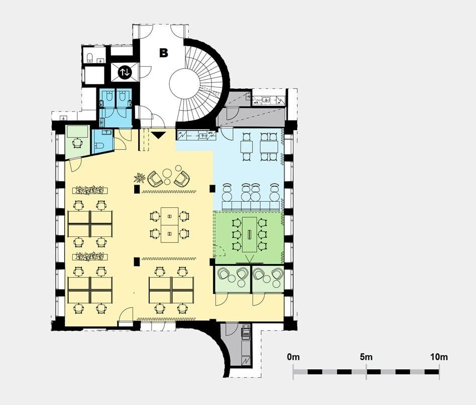 Vapaana toisen kerroksen moderni toimistotila, jonka sydämenä toimii yhteisöllinen working cafe -lounge. Monipuoliset työalueet ja neuvottelutilat tarjoavat tehokkaat puitteet erilaisiin työskentelytarpeisiin, ja tilasta löytyvät myös oma taukokeittiö sekä wc-tilat. Kokonaisuus on joustavasti yhdistettävissä naapuritiloihin vuokralaisen tarpeen mukaan. (Kuvat ovat rakennuksen muista tiloista.)