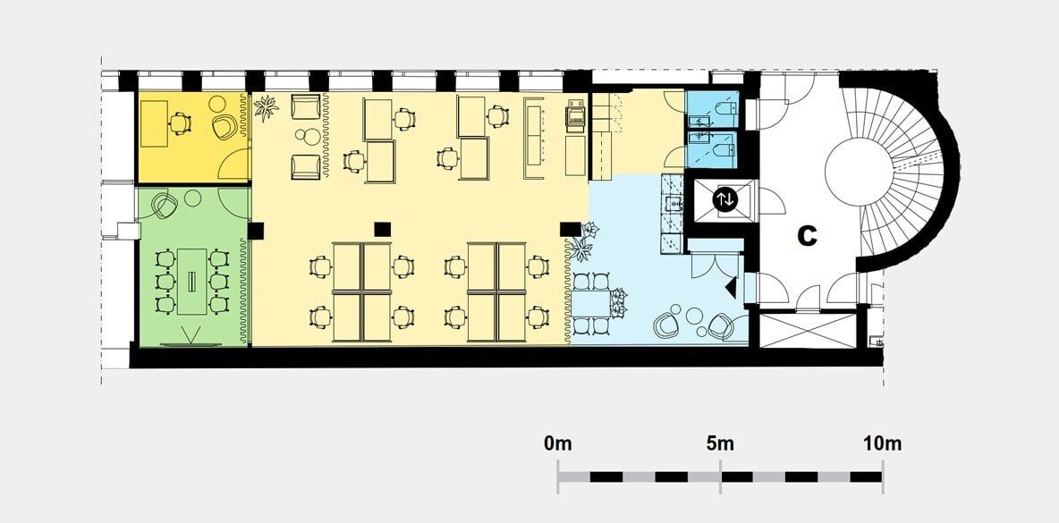 Toisen kerroksen tehokas avokonttori, jota täydentää työ- ja neuvotteluhuone. Valoisa toimisto tarjoaa viihtyisän työympäristön, ja tilaan rakennettava uusi keittiö sujuvoittaa päivän kulkua. Ilmoituksen kuvat on otettu rakennuksen muista tiloista.
