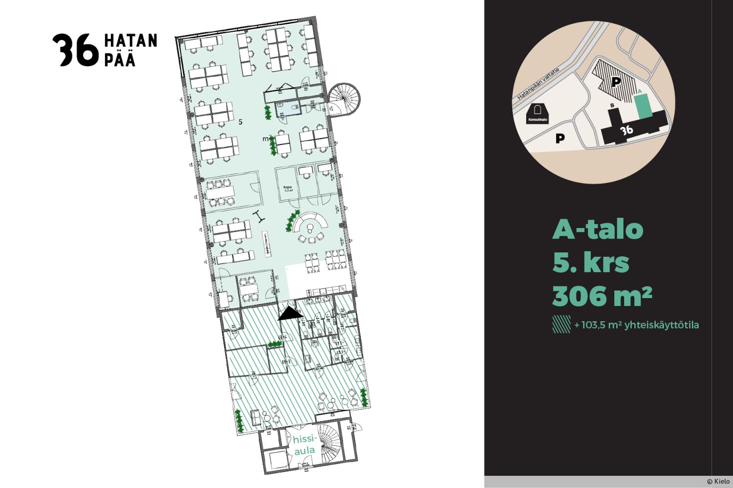 36Hatanpää on laajasti peruskorjattu Business Park -kiinteistö. Energiatehokkuus, hyvä sisäilma ja korkeatasoiset tilat olivat v. 2021 valmistuneen saneerauksen avaintekijät. Kohteella on LEED Gold -ympäristösertifikaatti. 36Hatanpään palveluihin lukeutuu mm. aulapalvelu, yhteiskäyttöiset neuvottelu- ja saunatilat, lounasravintola ja kuntosali sekä noin 400 pysäköintipaikkaa pysäköintihallissa ja pihalla, ml. asiakaspysäköinti. Vuokrattavia tiloja löytyy rakennusten ylimmistä kerroksista 5–6, poikkeuksellisen hienoin näkymin. Tilakoot alkaen n. 250 m²–2600 m². Tilakoosta riippuen tilalla on joko omat wc tilat tai yhteiskäyttöiset kerroksen muiden käyttäjien kanssa.