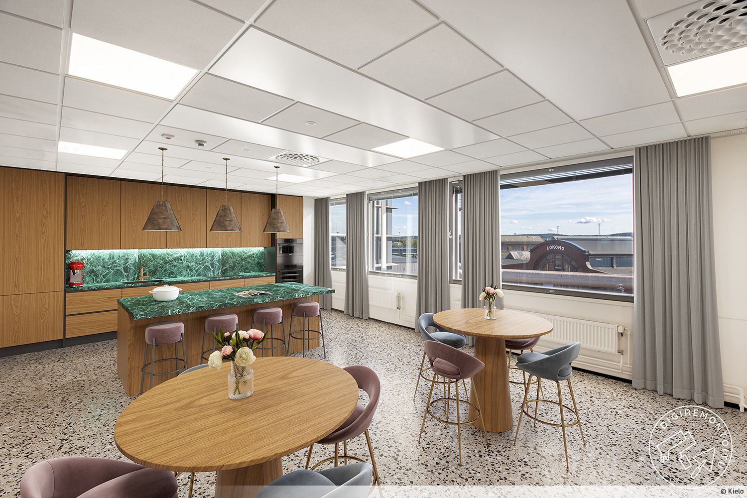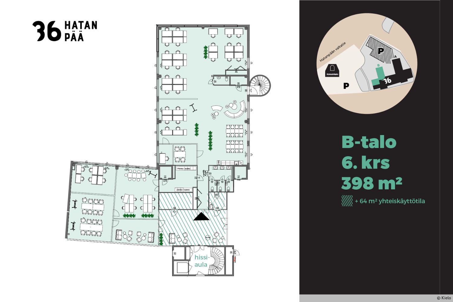 Vuokrattavana moderni kuudennen kerroksen toimistotila. Tässä valoisassa, pääosin avotilasta koostuvassa tilassa on erittäin toimiva pohja ja suuret ikkunat kolmeen suuntaan. Tilassa on myös omat vessat, keittiö ja huoneita hiljaiselle työlle. Toimitilan pinta-ala on 398 m², jonka lisäksi tilalle kuuluu 32 m² jyvitys yhteiskäyttötiloista.