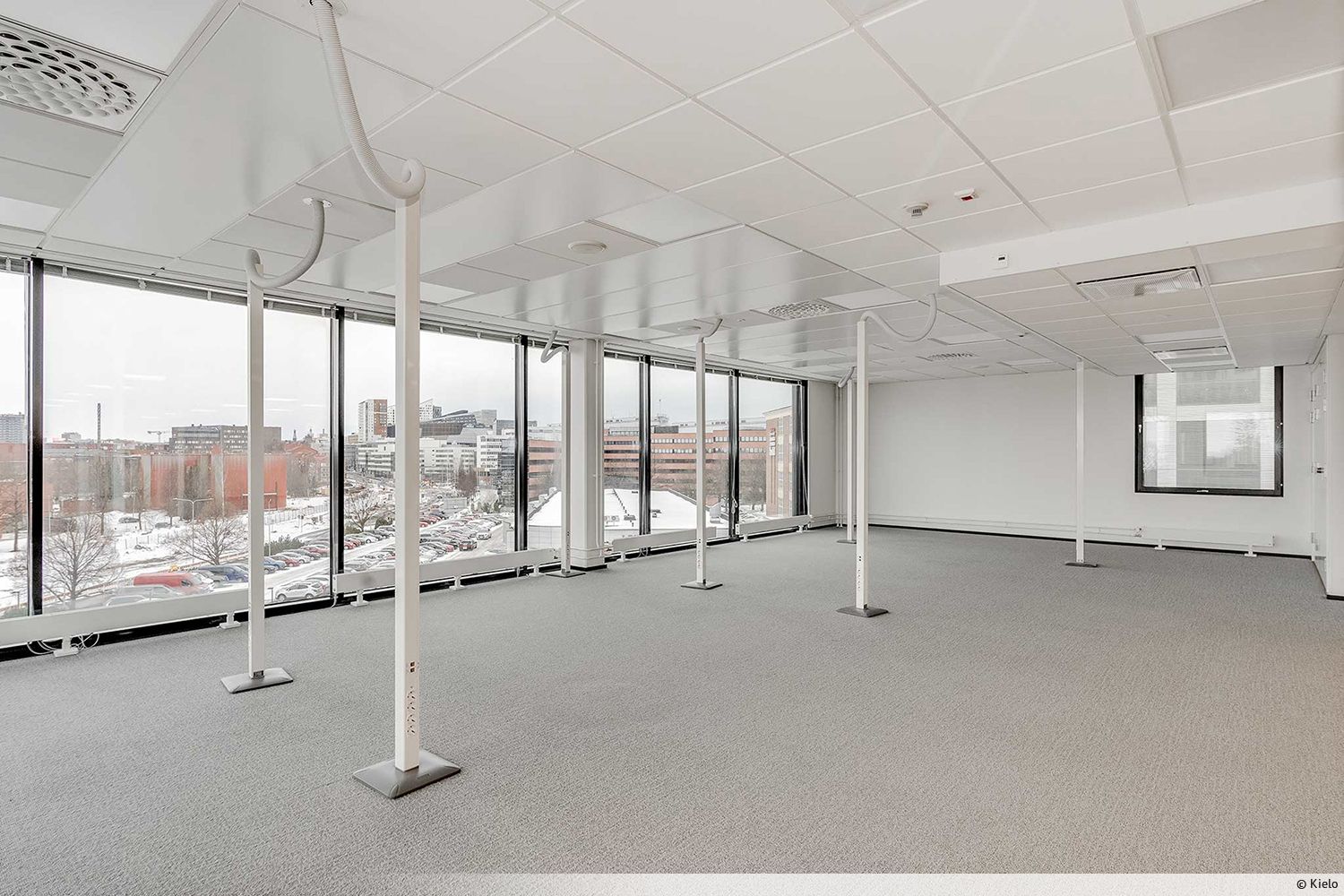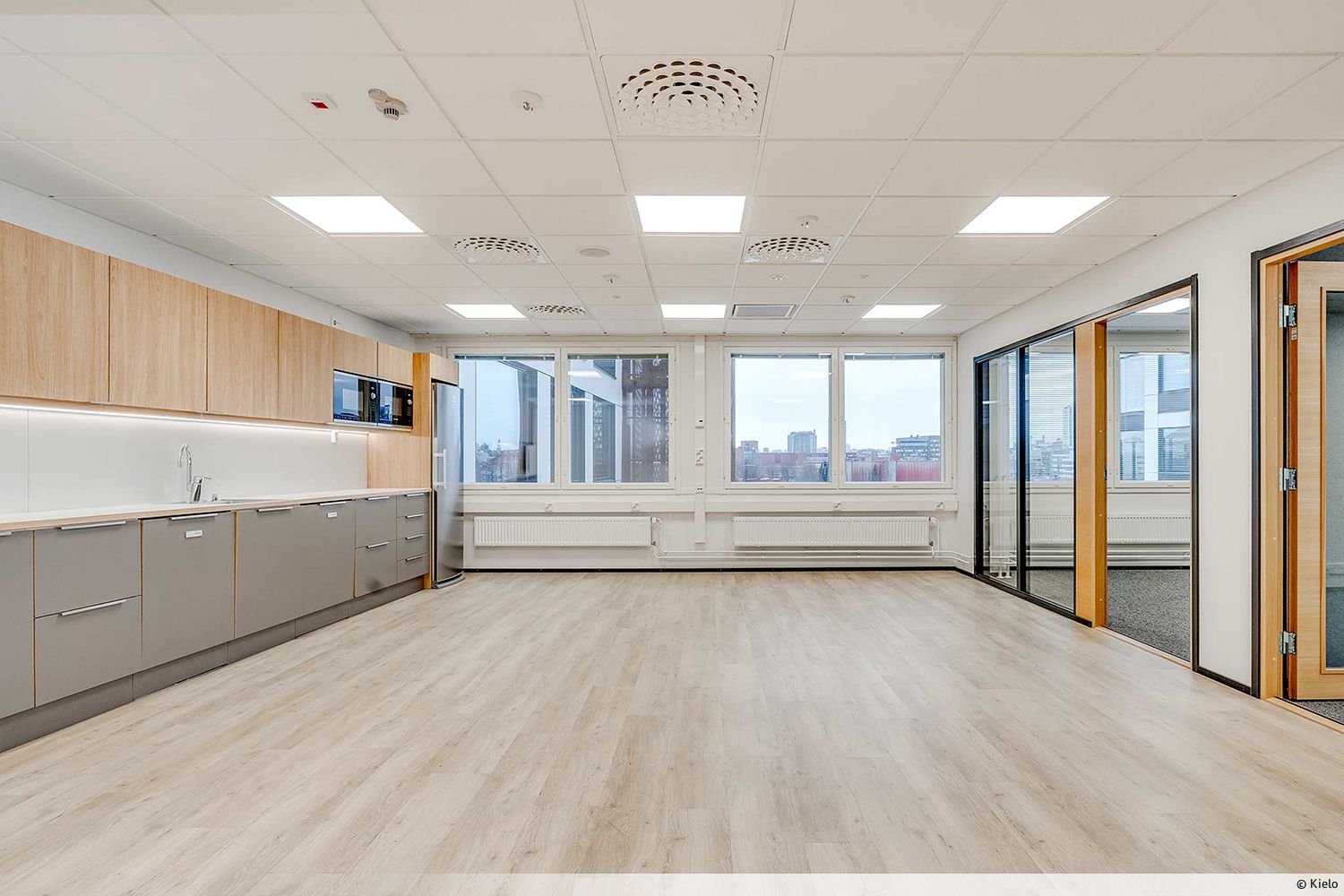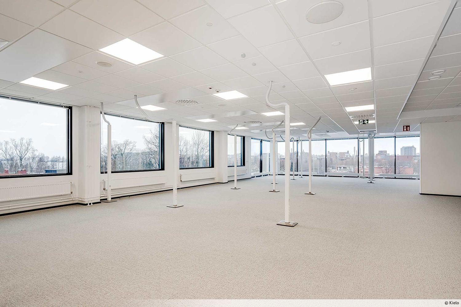 Vapautumassa vuokralle viidennen kerroksen nykyaikainen toimistotila. Tilassa on toimiva pohja ja valoa tuovat suuret ikkunat.