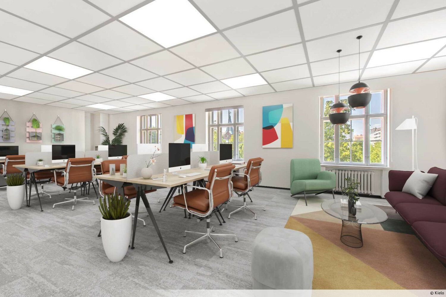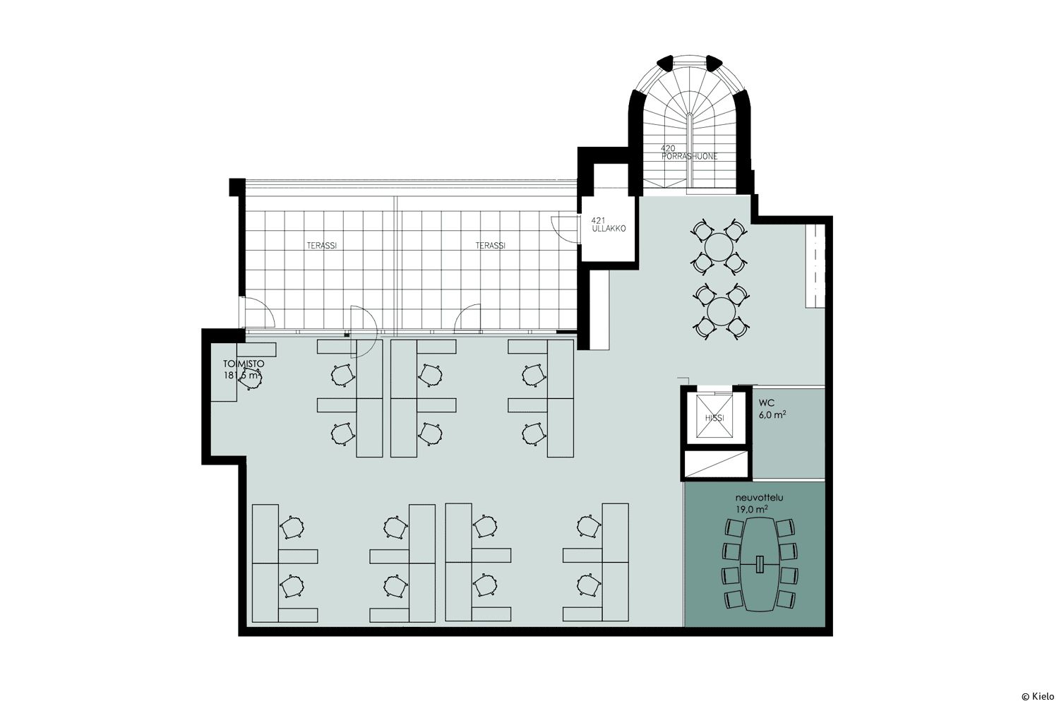 Uniikki ullakkohuoneisto omalla terassilla, josta näkymät pitkälle kaupungin yli. Nykyisellään saunatiloina toiminut huoneisto muutetaan toimistokäyttöön uuden vuokralaisen toiveiden mukaan. Esimerkkisovituksessa on 14 työpistettä, neuvotteluhuone ja keittiö-taukotila. Hissiyhteys suoraan tilaan.