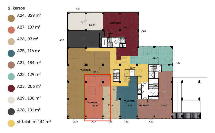 137 m² tila sijaitsee kiinteistön 2. kerroksessa ja koostuu avotilasta ja kahdesta huoneesta sekä wc-tiloista. Keittiö vuokralaisten yhteiskäytössä.