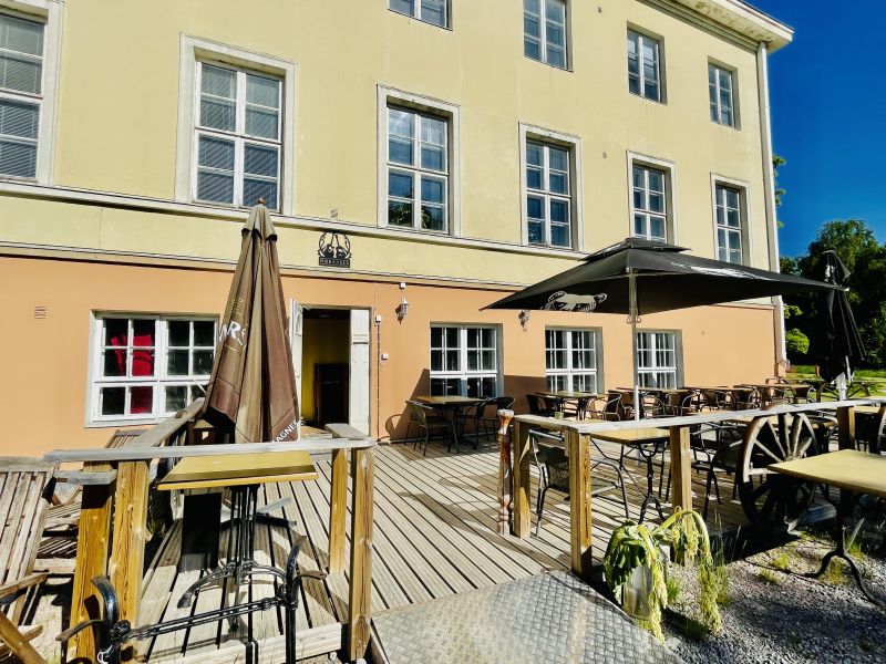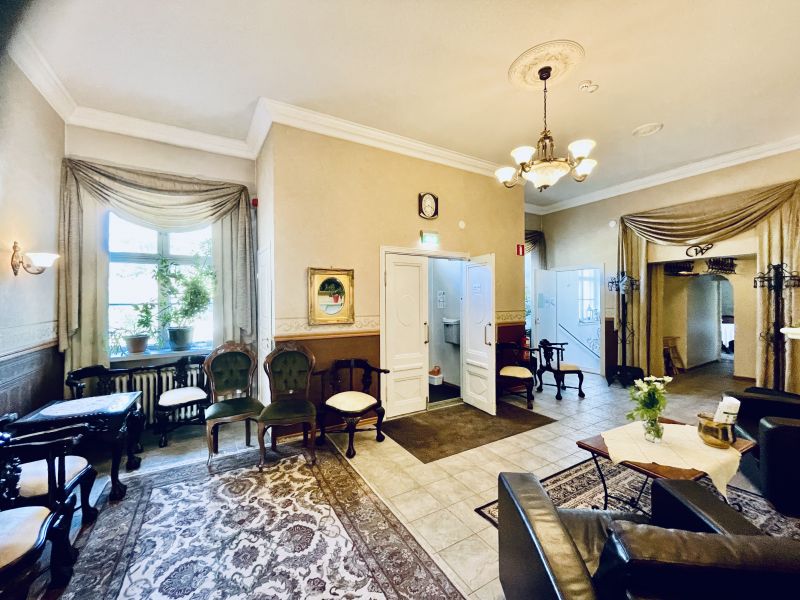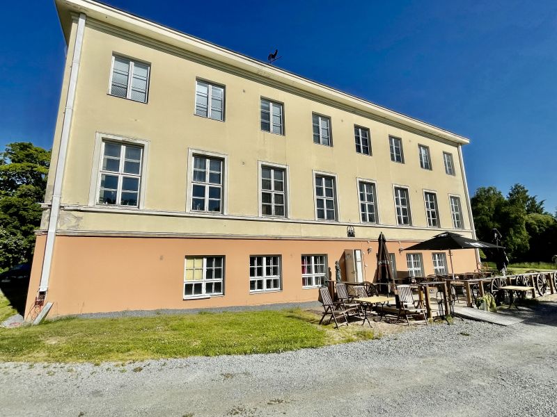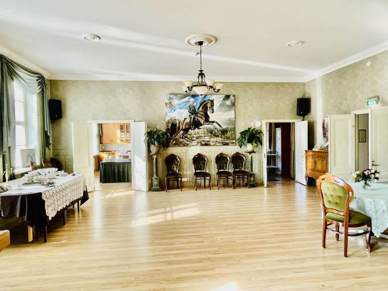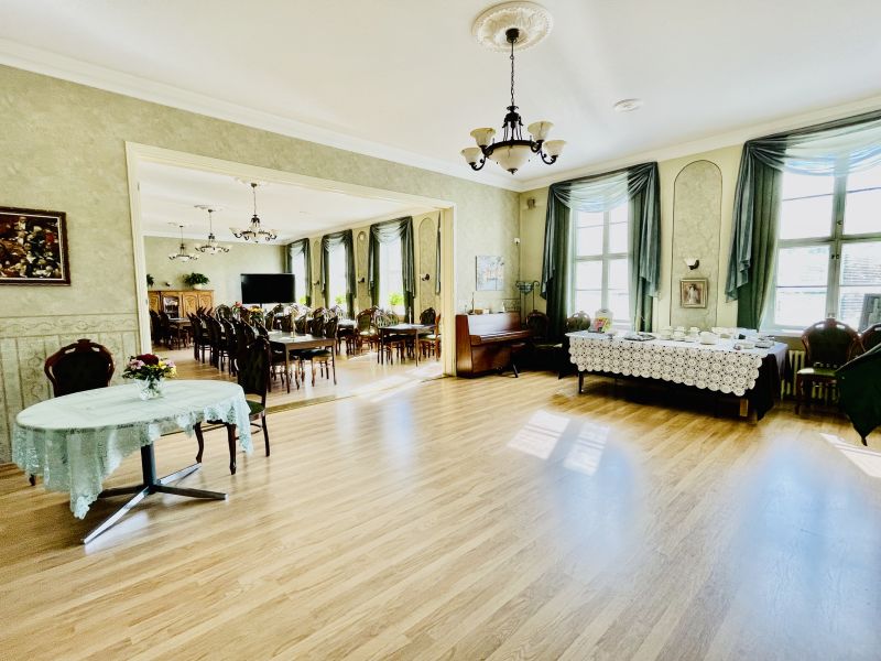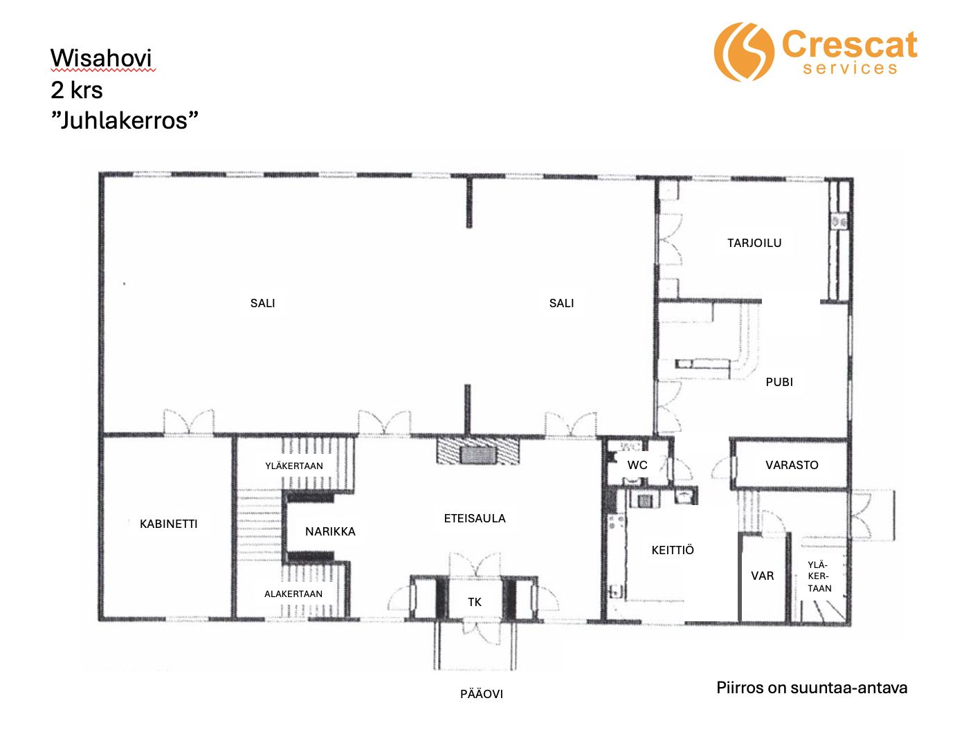 - Suuri juhlasali, tarjoilusali, kabinetti, pubi, keittiö huuvalla, eteisaula, naulakko ja varasto.