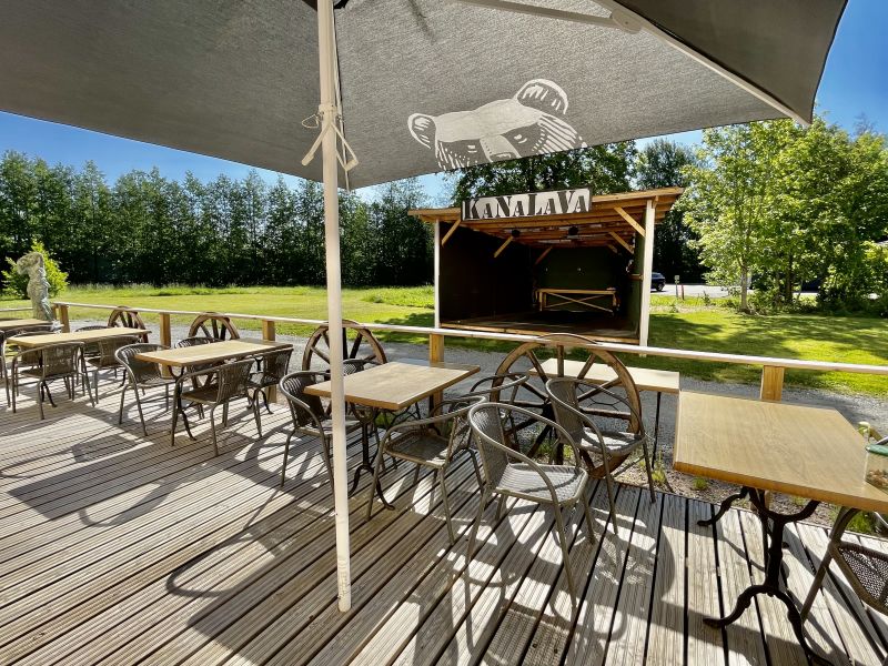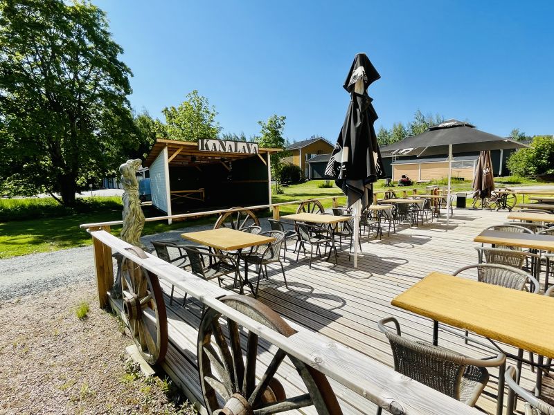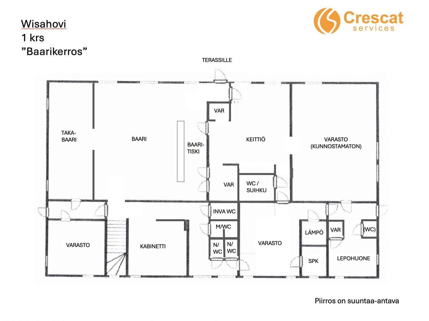 - Baaritilat, kabinetti, tilavat wc-tilat, suuri keittiötila huuvavalmiudella, varastotilat ja tekniset tilat. Takapihalla suojaisa terassi ja esiintymislava.