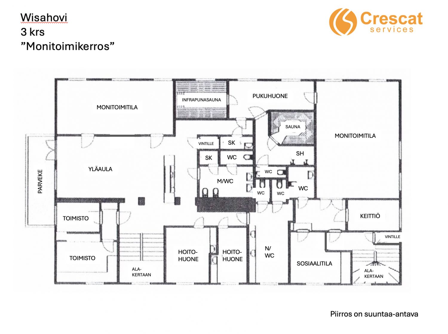 - Tilavia neuvottelu/monitoimitiloja 2 kpl, avarat aulatilat, useita wc-tiloja, pesuhuone- ja saunatilat (perinteinen sähkösauna + infrapunasauna), 2 kpl hoito/majoitushuoneita, 2 kpl toimistohuoneita, tarjoilukeittiö, sosiaalitilat, siivouskomero.