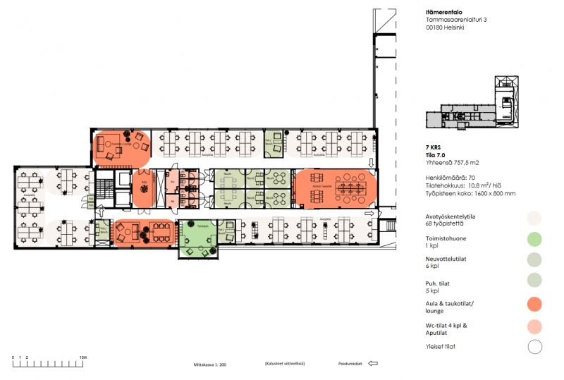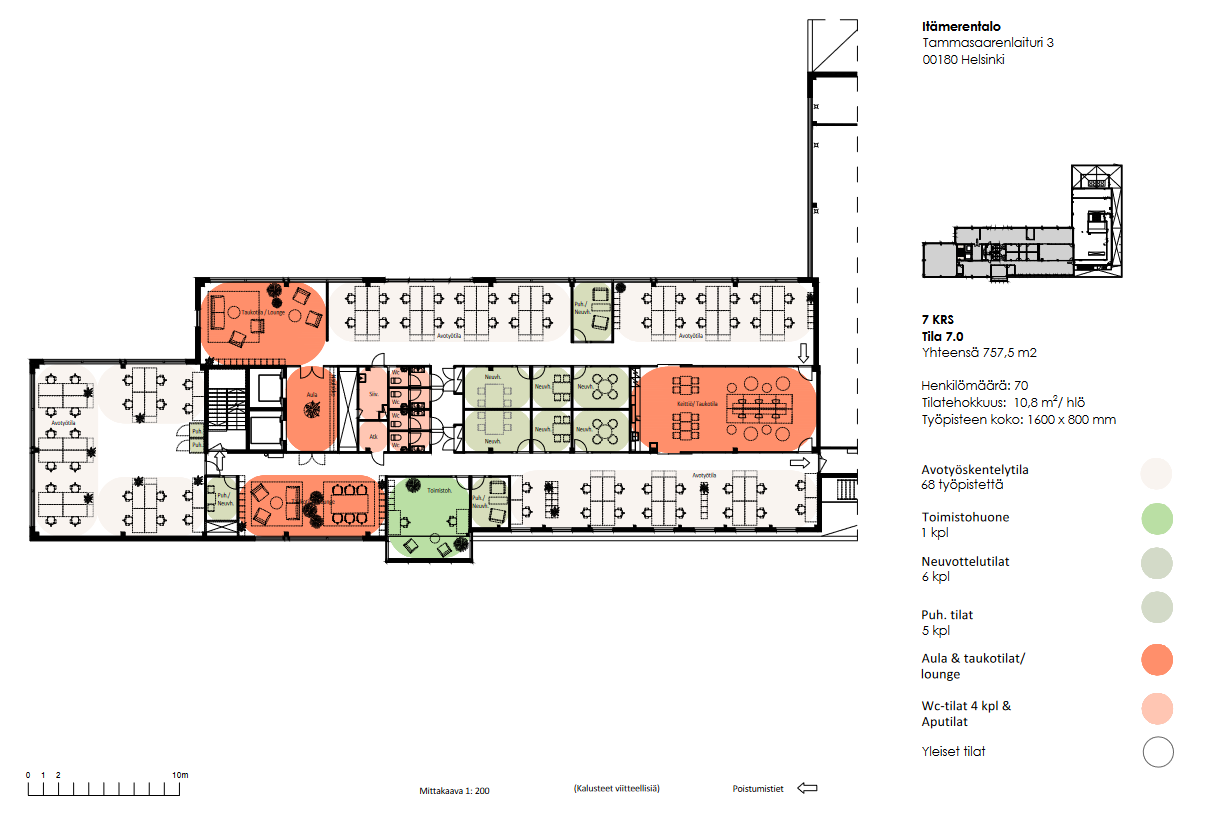Kiinteistön 7 kerroksen 757,5m² tila tarjoaa n. 70 henkilölle tehokkaat työskentelytilat. Tilat koostuvat avotyöskentelytilasta, toimistohuoneista, neuvottelutiloista, aula & taukotilat / lounge ja wc-tiloja 4 kpl & aputilat.