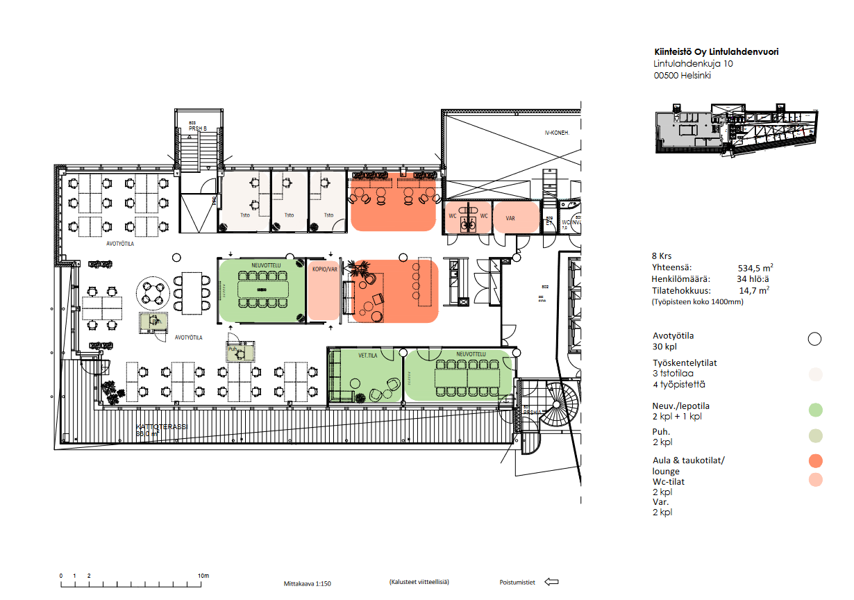 - 534.5m², 8 krs Upea ylimmän kerroksen toimisto merimaisemilla ja omalla isolla terassilla. Toimistosta saa tehokkaan avotilan muutamilla huoneilla. Näkymät kolmeen ilmansuuntaan. Tilan voi yhdistää alemman kerroksen toimistoon sisäportaalla.
