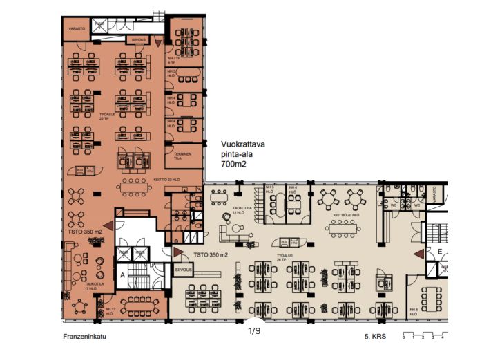 Tämä noin 700 m² toimistotila sijaitsee kiinteistön 5. kerroksessa. Toimistossa on huoneita, avotilaa sekä omat keittiö- ja wc-tilat.