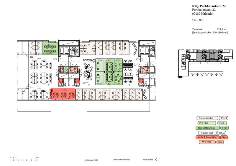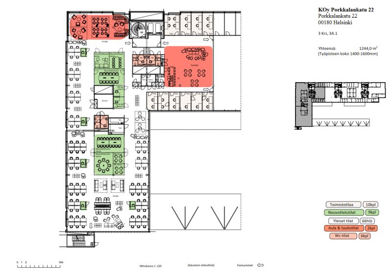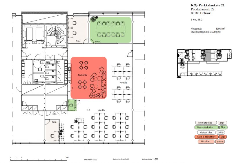 - 472m² Huonetoimistojen ja avotoimiston yhdistelmä, avotila sijaitsee keskellä ja huoneet reunoilla ikkunoiden ääressä. Ikkunat avautuvat sisäpihalle ja Porkkalankadun puolelle, läpitalon tila joka mahdollistaa työpisteiden sijoittelun ikkunoiden ääreen. Oma keittiö ja wc:t. Tilaan pääsee saapumaan helposti hissillä pysäköintilallista, kadulta ja toimistotalon aulasta.