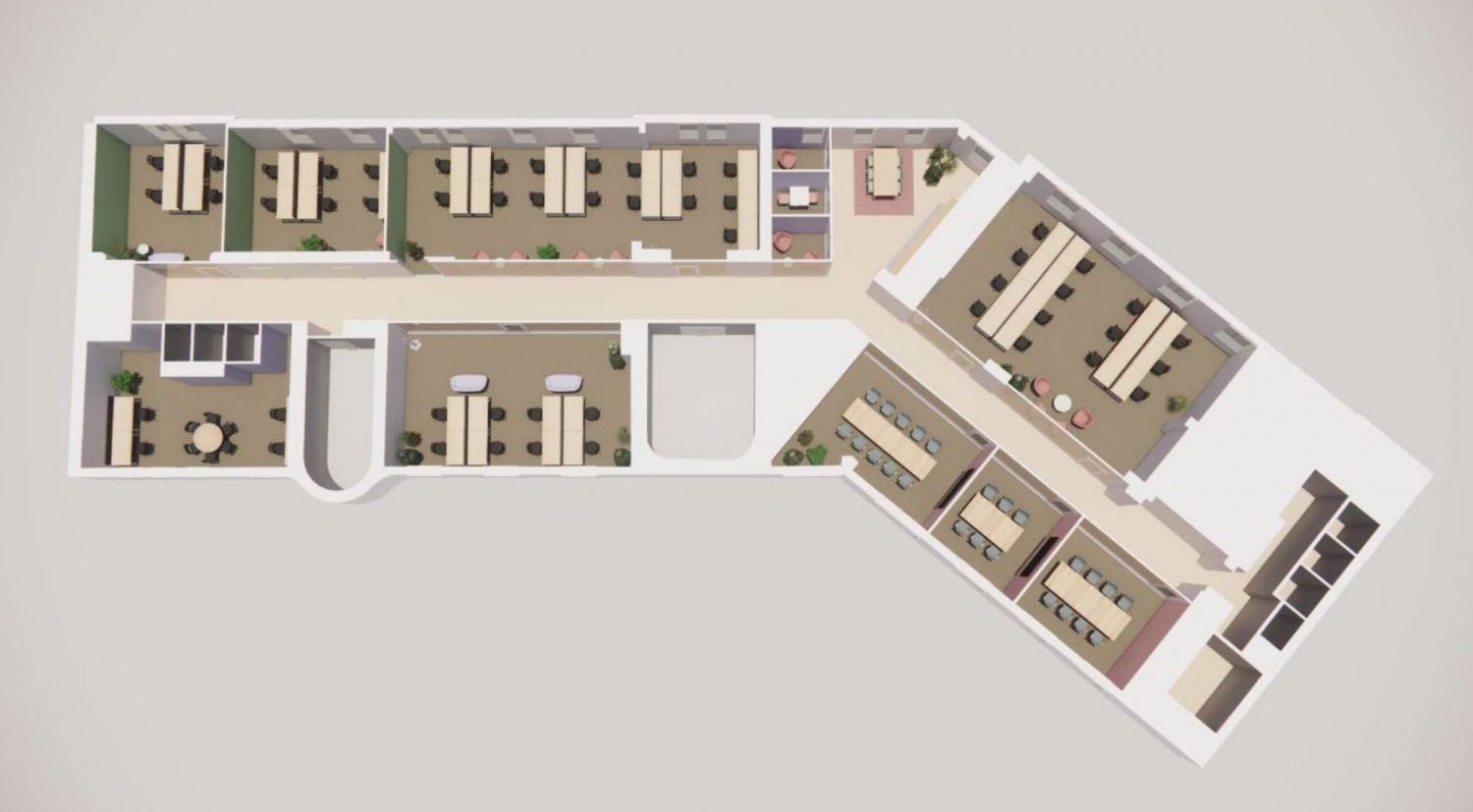 Kuudennen kerroksen monikäyttöinen toimistotila näkymillä Kamppiin ja Kampintorille. Pitkänomaisessa tomistossa tilaa on helppo jakaa eri tiimien välillä, jolloin kaikki saavat tarvitsemansa työrauhan sekä mahdollisuuden sosiaalisille kohtaamisille. Ylimmässä toimistokerroksessa riittää valoa, ja jopa rautatieasemalle saakka voi kulkea sateella kuivin jaloin Kampin luolastoja pitkin.