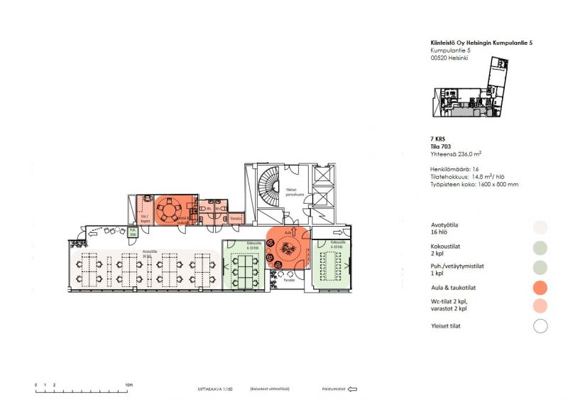 - 236m², 7 kerros. Ylimmän kerroksen toimisto, jossa on käytössä oma parveke. Tehokas toimisto avotilalla ja kahdella neuvotteluhuoneella.
