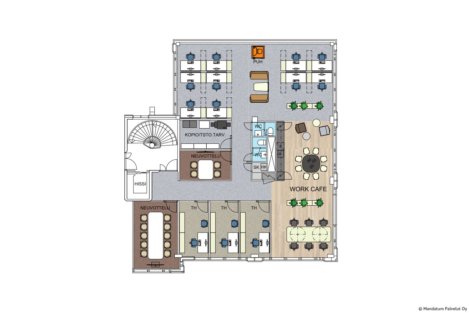 Tilan ominaisuudet: tilassa on ilmastointi, avo-/kombitoimisto