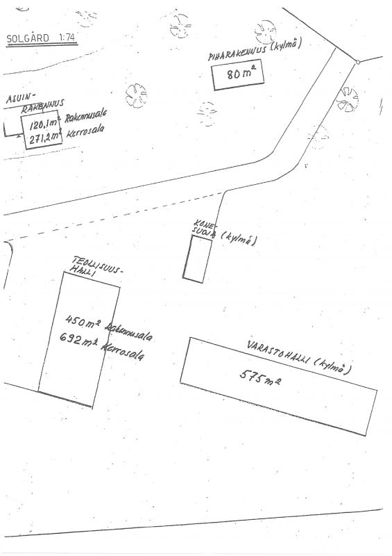 Rakennukset: 692k-m2 teollisuushalli, 575 k-m2 varastohalli + kylmä konesuoja. Lisäksi tontilla sijaitsee 271 m2 omakotitalo, autotallirakennus, piharakennus, sekä kunnostusta vaativa lampi. Teollisuushallissa lastauslaituri, sisäänajomahdollisuus ja kaksi nosto-ovea. (esitteessä tilan epävirallinen asemapiirros).