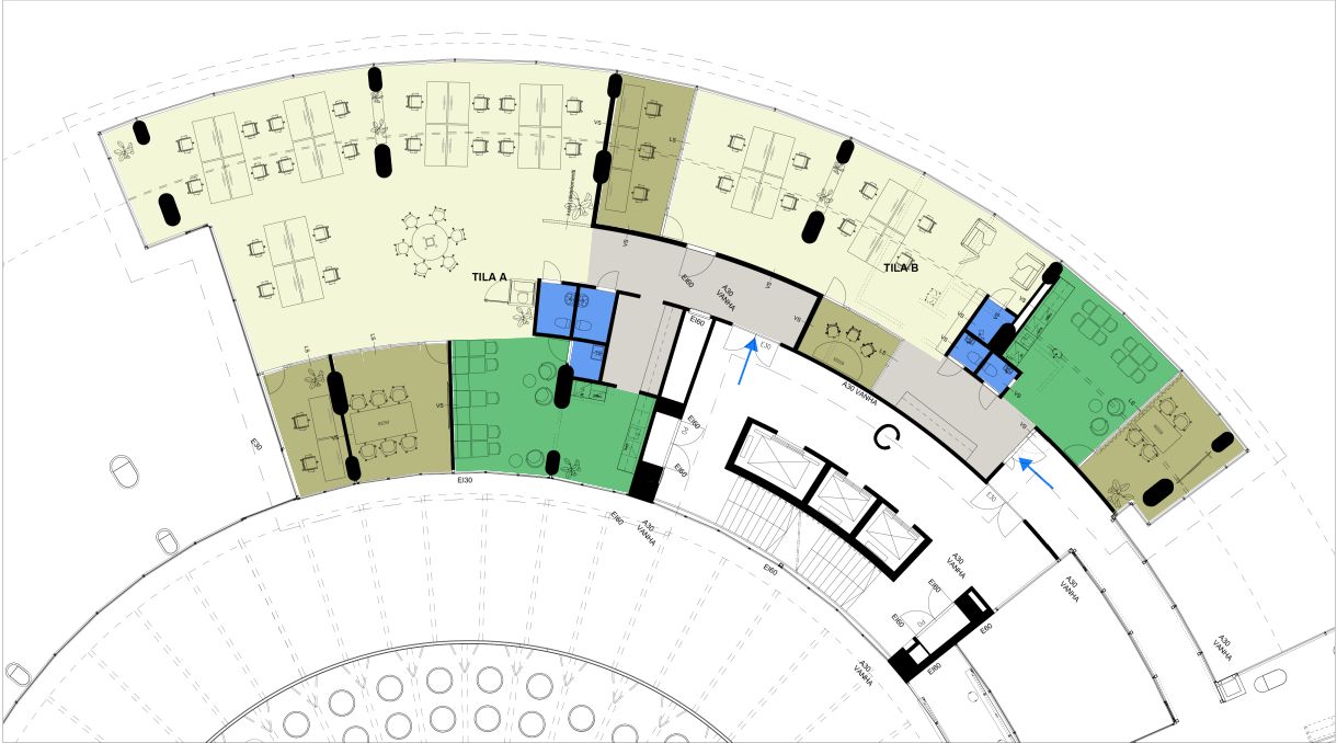 Kiinteitön toiseen kerrokseen tullaan remontoimaan 170 ja 269 m2 kokonaisuudet vuokralaisen toiveiden mukaisesti. Tilat noudattavat konseptoitua korkealuokkaista toteutusta, joka kestää aikaa ja tarjoaa laadukkaat työskentelypuitteet. Tiloista löytyy ratkaisut niin neuvotteluihin, vetäytymiseen kuin avokonttori työskentelyyn. Nämä tilat kutsuvat käyttäjänsä viihtymään.